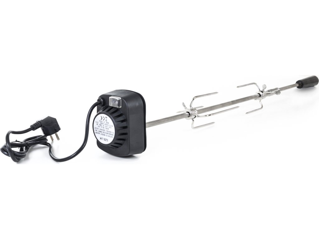 Z jedné strany je jehla opatřena odnímatelným plastovým držadlem, na kterém je praktické očko pro uchycení. Z druhé strany se nachází motorek v plastovém krytu, na kterém je umístěno tlačítko na zapínání / vypínání. Motorek s napětím 230 V jednoduše zapojíte do elektřiny pomocí kabelu v délce cca 125 cm. Motorek s jehlou otáčí rychlostí asi 2 otáčky za minutu, aby se připravovaný pokrm nepřipékal, ale pekl se rovnoměrně.