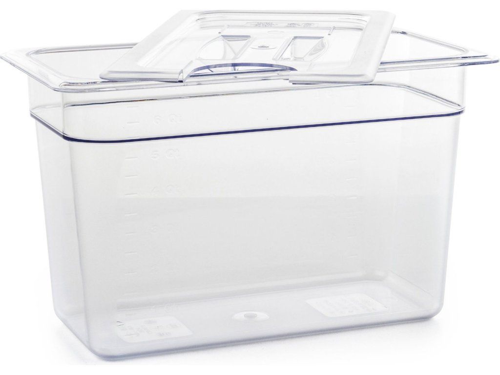Nádoba G21 pro sous-vide vaření je vyrobena z vysoce odolného polykarbonátu a oproti kovovým hrncům efektivněji udržuje teplotu a zahřátí vodní lázně trvá kratší dobu. Polykarbonát splňuje nejpřísnější požadavky na bezpečnost a je zdravotně nezávadný. Díky vysoké stálosti použitého materiálu je možné nádobu mýt v myčce na nádobí, což vám ušetří mnoho času i námahy s úklidem. Dále je nádoba vybavená sundavací poklicí s výřezem na sous-vide vařič. Poklici však lze používat i s vařičem jiné značky, neboť se do otvoru vejde většina vařičů na trhu.