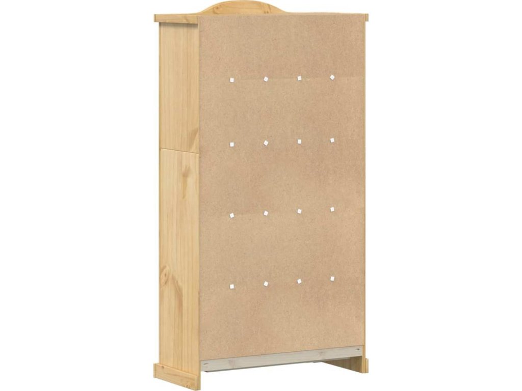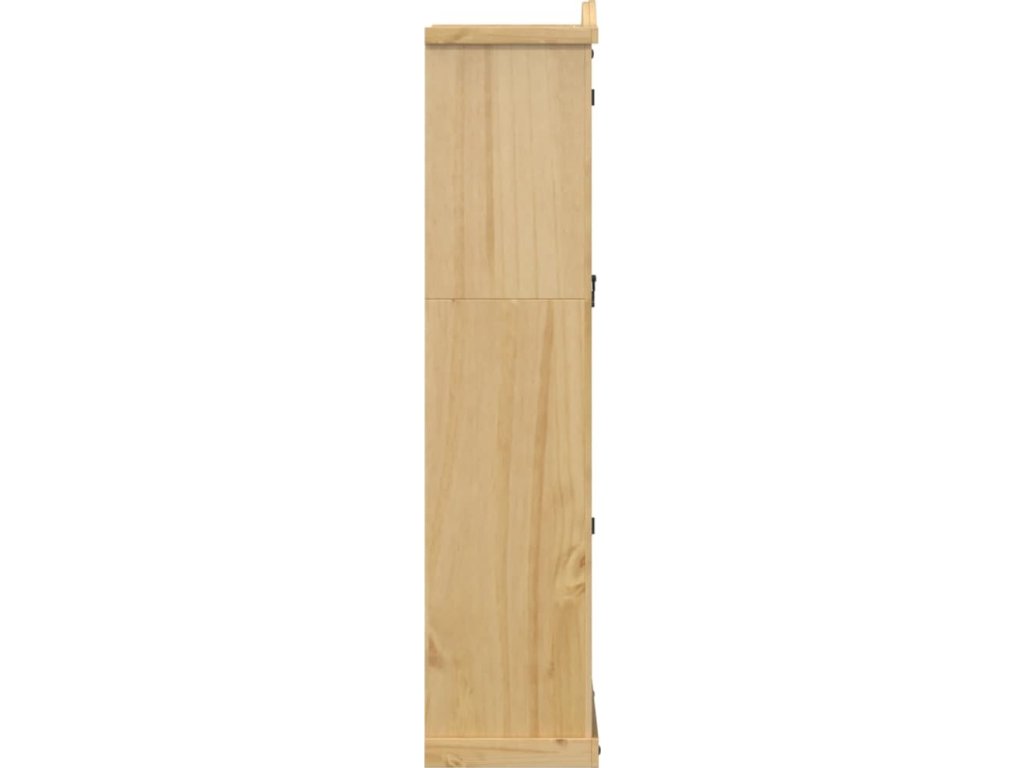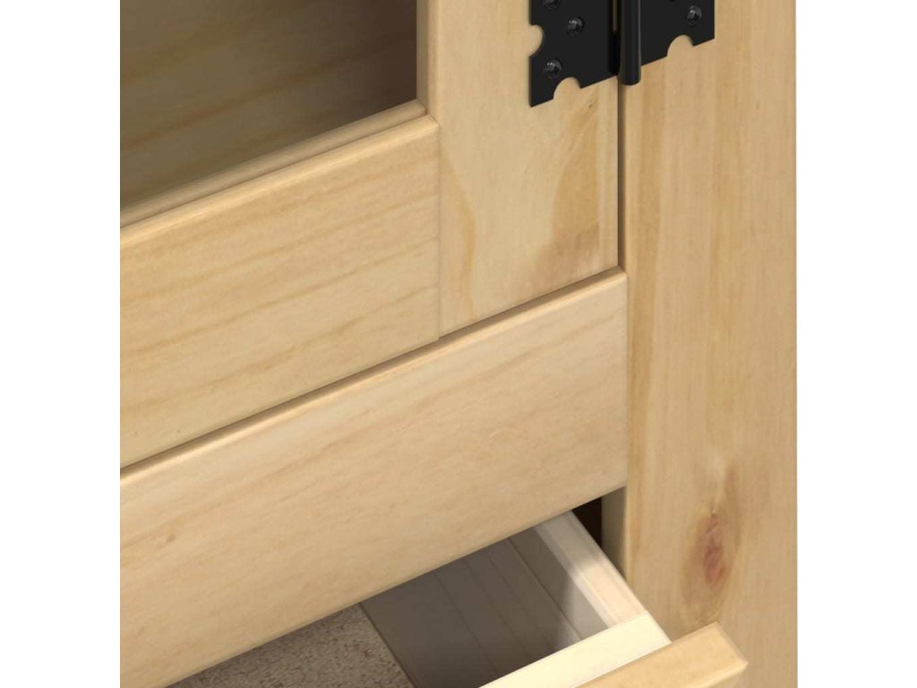 - Masivní borové dřevo: Masivní borové dřevo je krásný přírodní materiál. Borové dřevo má rovnou kresbu a obsahuje suky, které materiálu dodávají jeho charakteristický, rustikální vzhled. Vitrína je vyrobena z masivního borového dřeva, je tedy odolná a robustní.