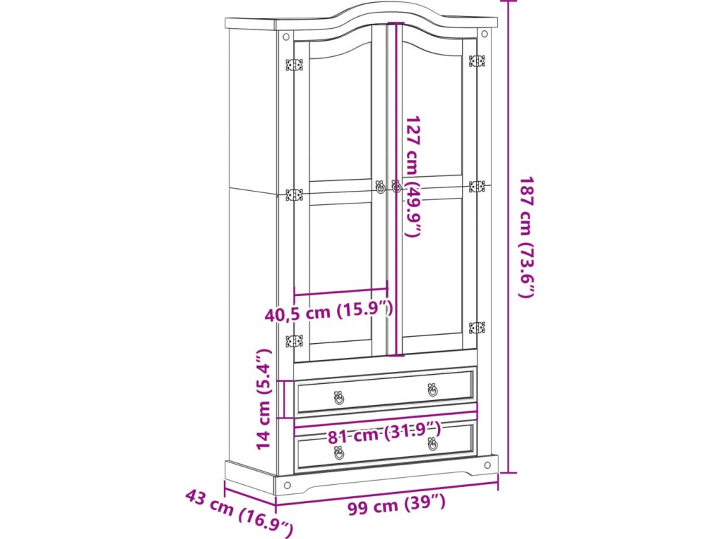 - Rozměry: 99 x 43 x 187 cm (Š x H x V)