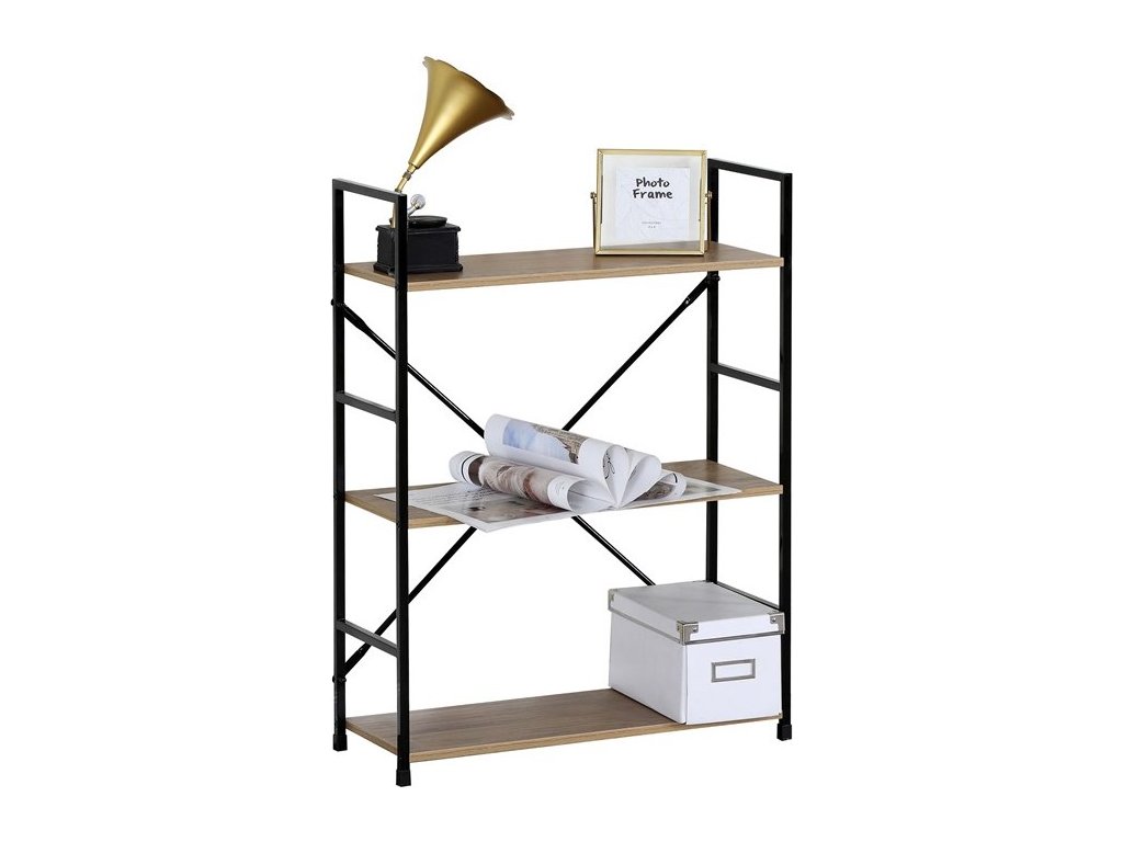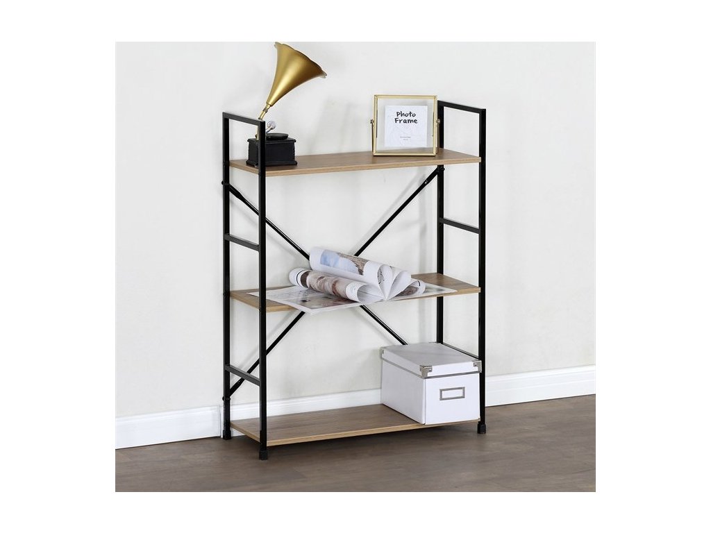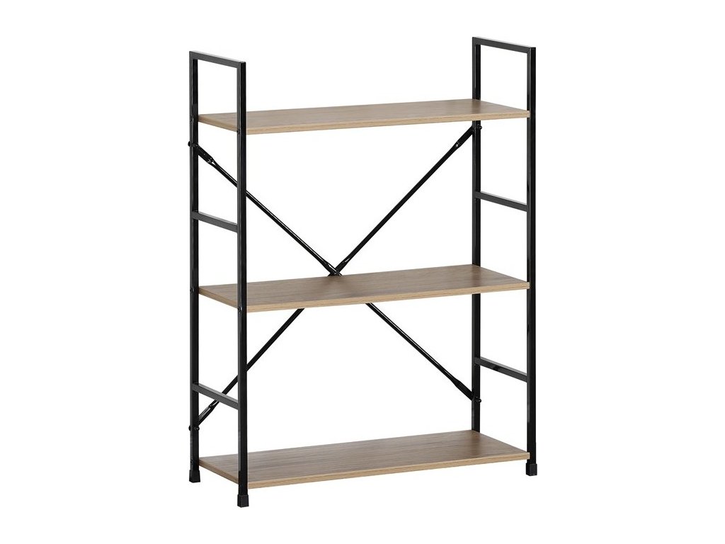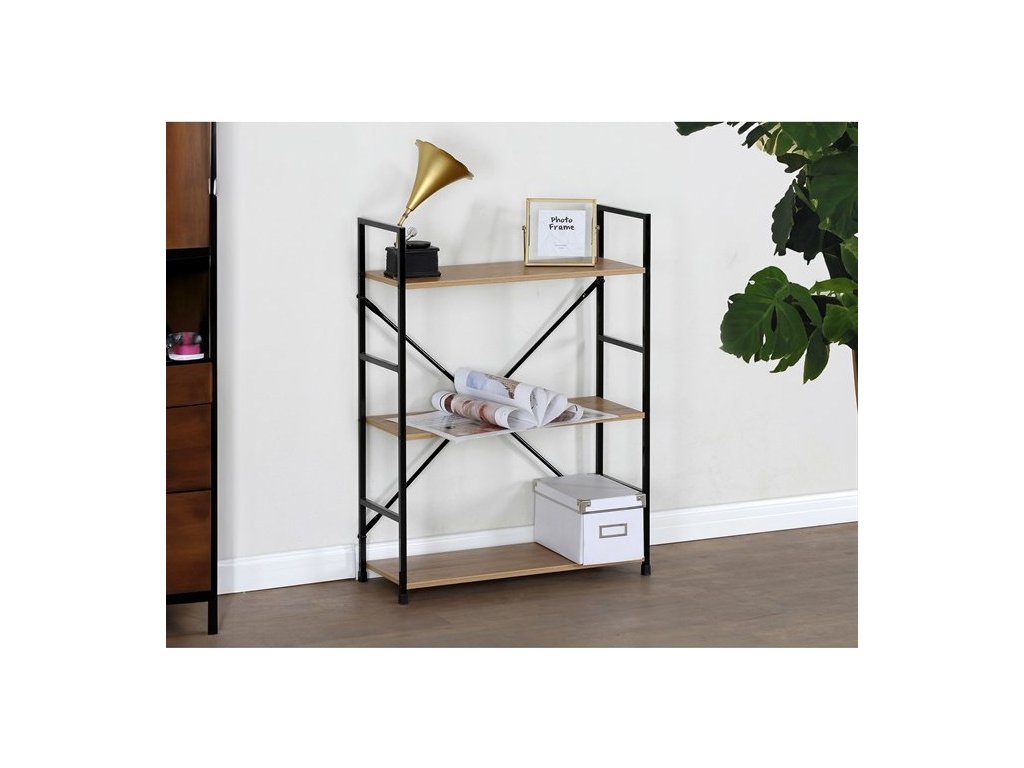 Odlehčený policový regál. Kostra vyrobena z kovových hranatých profilů černé barvy. Na police je použita MDF deska s povrchovou úpravou 3D folie v textuře dubu. Pro lepší stabilitu je na zadní straně kovová výztuha ve tvaru písmene X. Balení obsahuje sadu umožňující připevnění ke stěně.