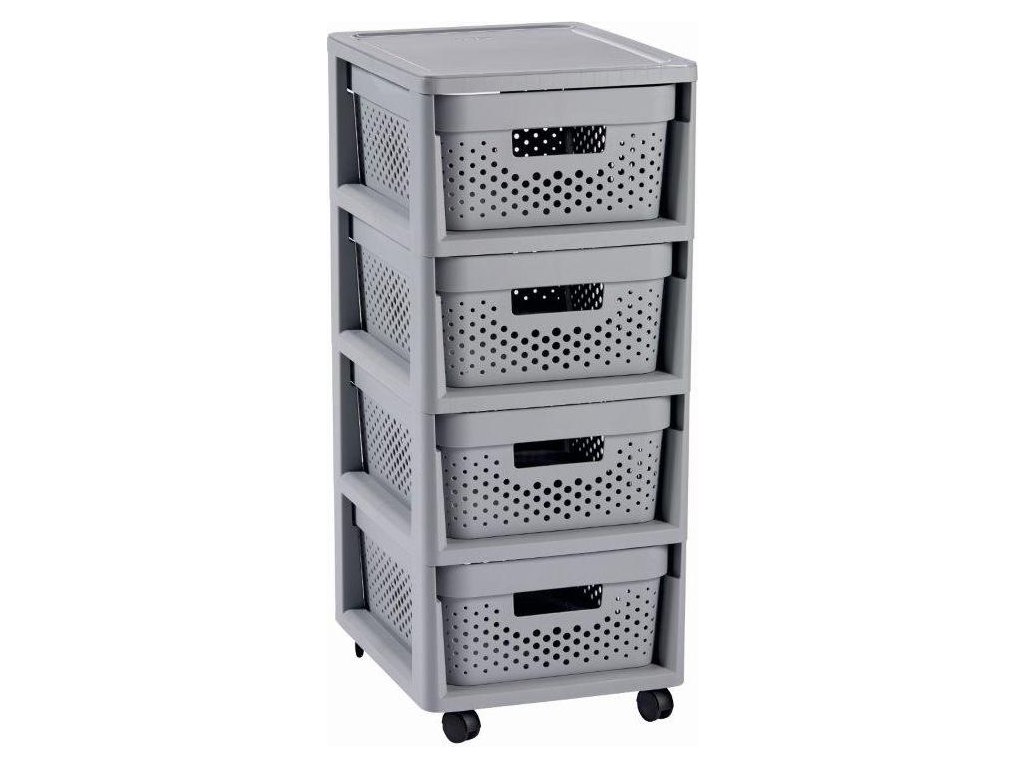 Světle šedé boxy v regálu Infinity Dots značky Curver jsou vyrobené ze