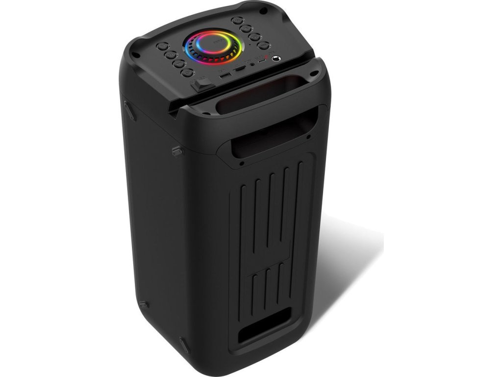 Reproduktor má opravdu široké možnosti ovládání a připojení. Na horním panelu najdete například tlačítka pro přehrávání, přepínání režimů a ovládání hlasitosti. Díky konektorům USB-A, USB-C, microSD slotu, AUX vstupu a 6,3mm jacku pro mikrofon připojíte vše, co potřebujete. Reproduktor podporuje Bluetooth profily L2CAP, AVRCP, HSP, HFP a díky dosahu až 10 metrů si hudbu užijete bez zbytečných kabelů.