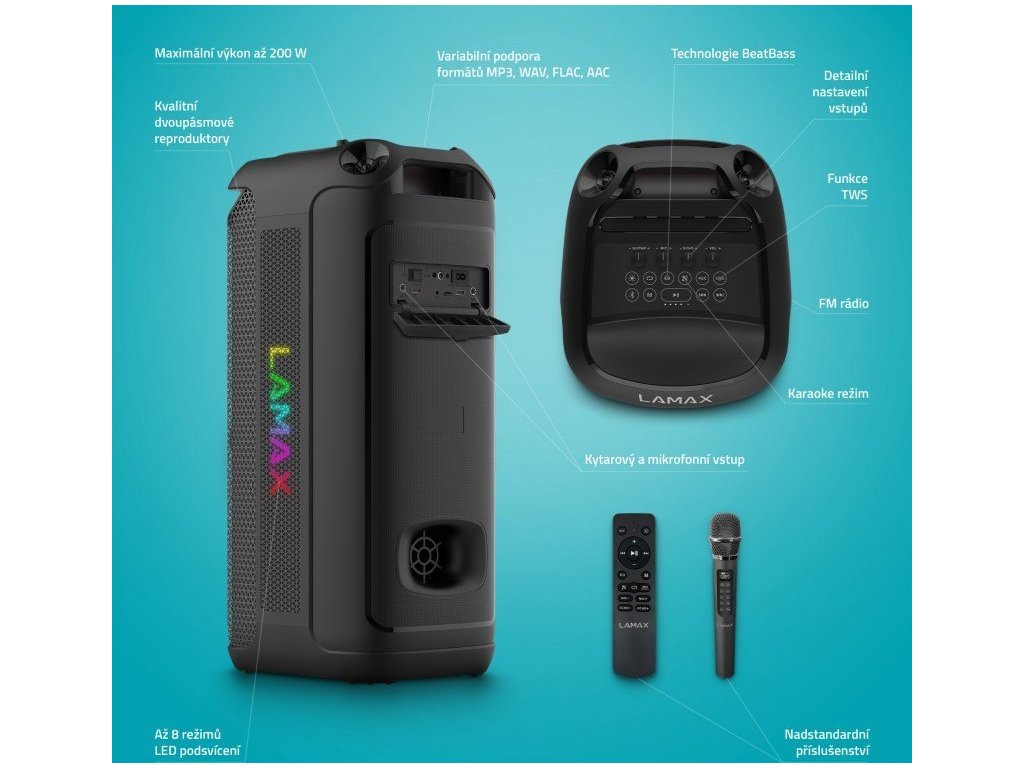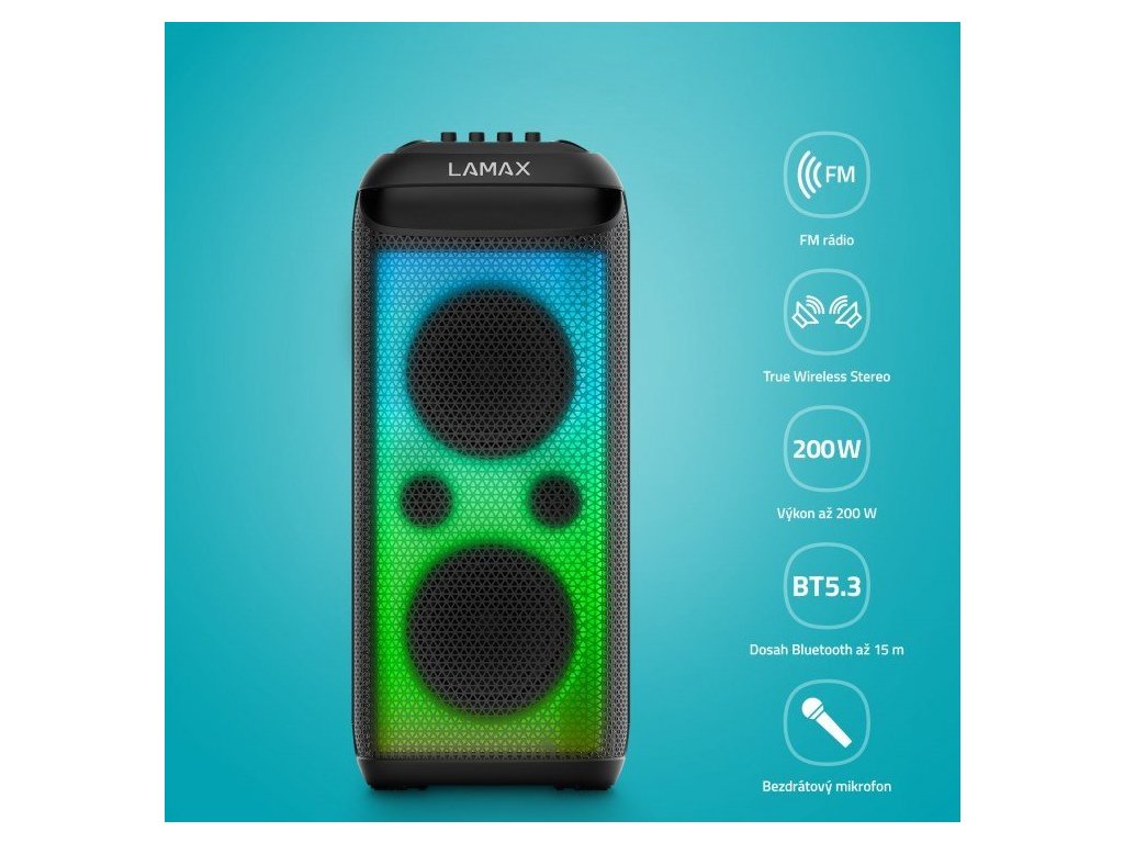 Vezměte si na párty bezdrátový reproduktor Lamax PartyKing1 Max s výkonem 200 W. Zaposlouchejte se do silného, plného a bohatého zvuku dvoupásmových reproduktorů. Díky technologii BeatBass zní přehrávaná hudba zkrátka dokonale. Přístroj má kompaktní rozměry, takže ho kdykoliv a kamkoliv pohodlně odnesete. Využijete ho na rodinných sešlostech, venkovních oslavách nebo třeba během grilování.