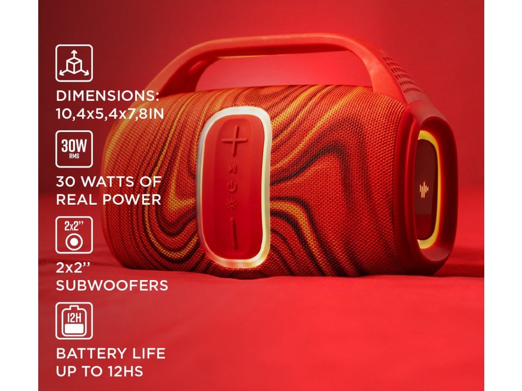 Reproduktor Stromberg GROOVE – stylový parťák na každou akci. Moderní design v červené barvě zaujme na první pohled. výkon 30 W a výdrž baterie až 12 hodin vám pak zajistí skvělý hudební zážitek bez přerušení. Díky funkci Stromberg Connect si navíc můžete vychutnat ještě silnější stereo efekt.