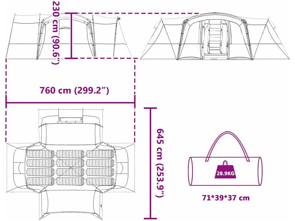 Tento rodinný kempovací stan je skvělou kombinací moderního stylu a funkčnosti, co poskytuje domov daleko od domova pro milovníky outdoor aktivity. S jeho rozměry je dost pro všechny, aby se vyspali, odpočinuli si a uložili si věci. Je hezky stylizovanej a zapadne do jakýhokoli kempu, a dodává potřebnou ochranu před nepřízní počasí pro ty, co chtějí dobrodružství.