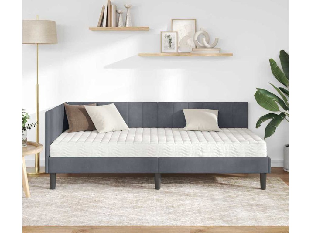 Tento rohový rám postele s matrací výborně spojuje moderní vzhled s každodenní funkčností. S jasným obdélníkovým tvarem je určen pro ty, co mají rádi jednoduchost a čisté linie. Hezký sametový povrch a elegantní design z něj dělají skvělý doplněk do každé ložnice, zatímco rám postele dodává útulný pocit. Perfektně se hodí k sezení i spaní, jeho umístění v rohu šetří prostor, což je ideální pro malé byty nebo minimalisticky zařízené pokoje.