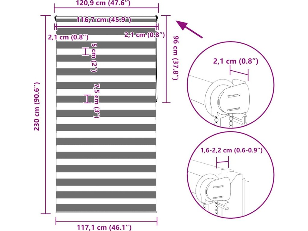 - Rozměry rolety: 120 x 230 cm (Poznámka: Šířka dále jen jako šířka horního rámu, látka je o 3 cm užší než horní rám.)