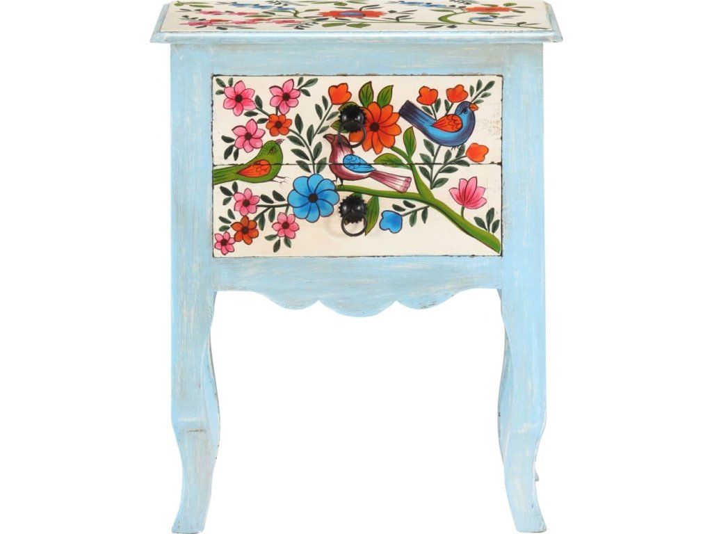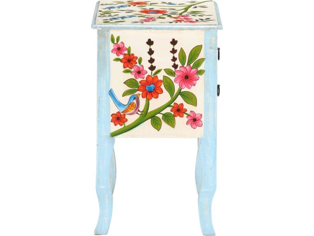 Tento krásný unikátní dřevěný noční stolek je zdobený bohatými, ručně malovanými ornamenty a svým barevným designem krásně prozáří vaši ložnici.