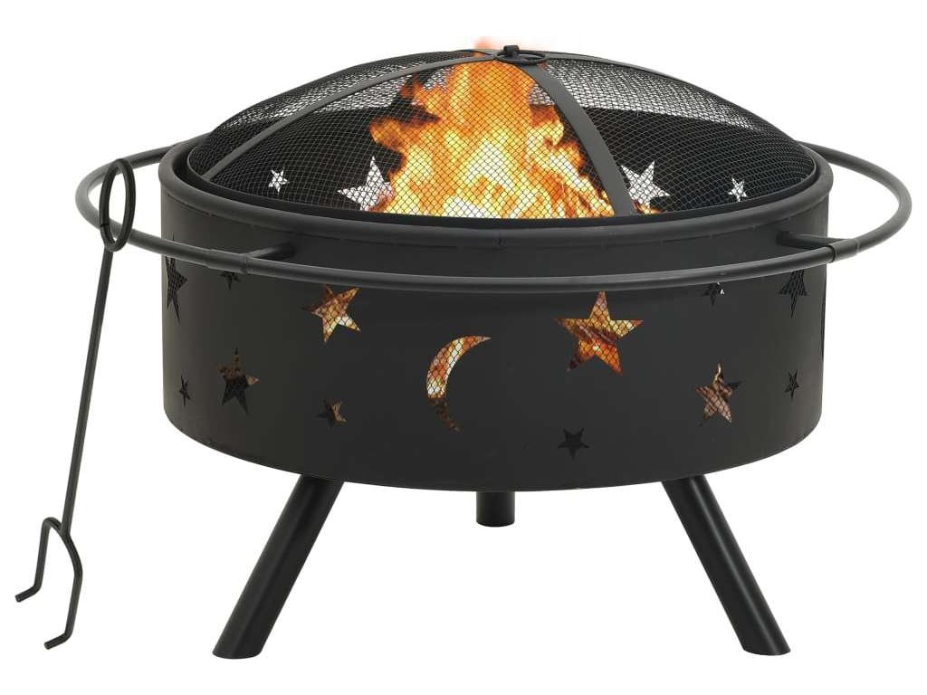 Přenosné ohniště je vyrobené z oceli a skvěle absorbuje a vyzařuje teplo. Má širokou a hlubokou mísu, ve které snadno založíte velký táborák pro celou rodinu. Pletivový kryt vám umožní sledovat hořící oheň a zároveň brání odletování jisker a úlomků, a zajišťuje tak více bezpečí. V pletivovém krytu je též praktický kroužek, za který ho můžete snadno přenášet. Přiložený kovový pohrabáč lze použít jak k sejmutí pletivového krytu, tak k přeskupení palivového dříví.