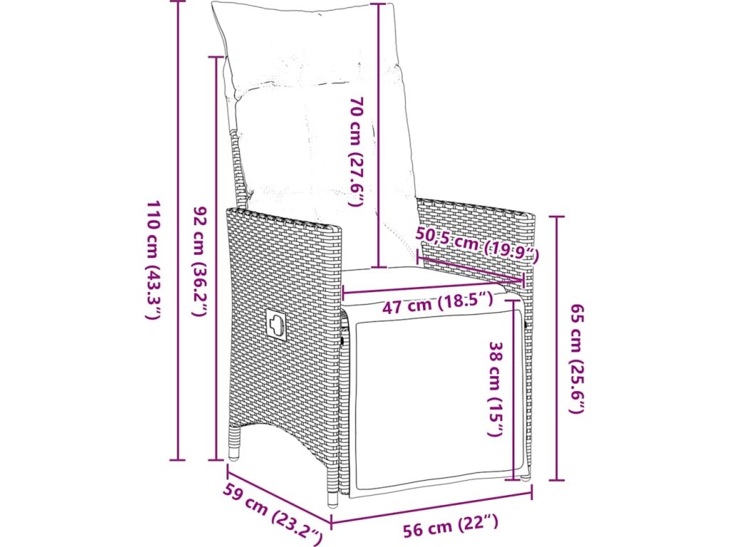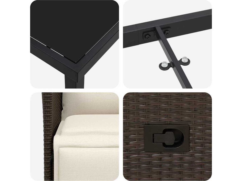 - Materiály z polyratanu Zahradní jídelní set je vyrobený z odolného polyratanu, který je UV stabilní a dlouho vydrží. Dlouho si zachovává skvělý vzhled, i za špatného počasí, takže je ideální pro venkovní použití. Textura a pocit polyratanu vytvářejí příjemnou atmosféru pro luxusní venkovní stolování.