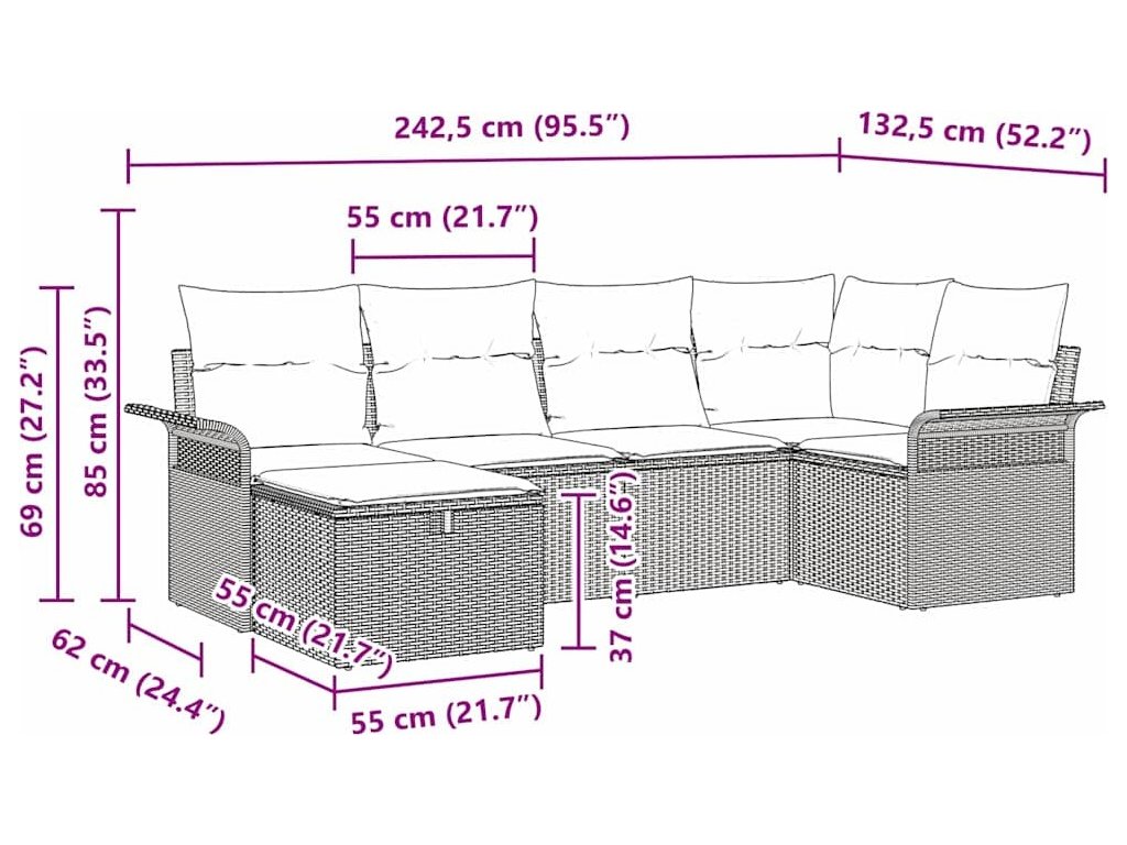 - Celkové rozměry: 242,5 x 132,5 x 85 cm (D x Š x V)
