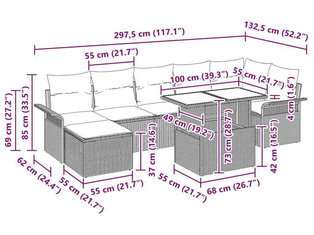 - Komplexní komponenty Souprava má pohodlné polštáře plněné polyesterem a se zipem pro jednoduchou údržbu. Každý kus, včetně sedacích podložek a modulárních sekcí, přidává na komfortu a praktičnosti. Tvrzený skleněný stůl dodává sofistikovaný povrch pro obsluhu občerstvení.