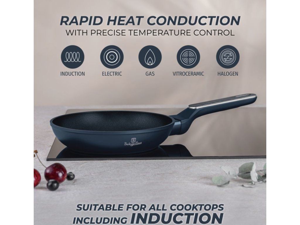 Sada pánví Berlingerhaus BH-8379 z řady Deep Sea Collection je vyrobena z kovaného hliníku a opatřena odolným titanovým povrchem TitanPro, který zaručuje nepřilnavost a možnost vařit bez připalování. Elegantní matná modrá barva s dřevěnými akcenty dodá každé kuchyni jedinečný styl. Rukojeti skvěle padnou do ruky a zůstávají chladné, i když je plotna rozpálená. Indukční turbo dno zajistí rychlé a rovnoměrné zahřátí a univerzální použití na všech typech sporáků. Nádobí je navíc šetrné k životnímu prostředí a velmi snadno se čistí.