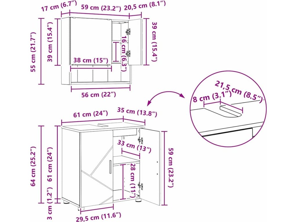 - Komplexní řešení úložného prostoru: Set obsahuje umyvadlovou a zrcadlovou skříňku, které splňují různé úložné potřeby. Umyvadlová skříňka nabízí dostatek místa na věci, zatímco zrcadlová skříňka ukrývá kosmetiku a udržuje úhlednost.
