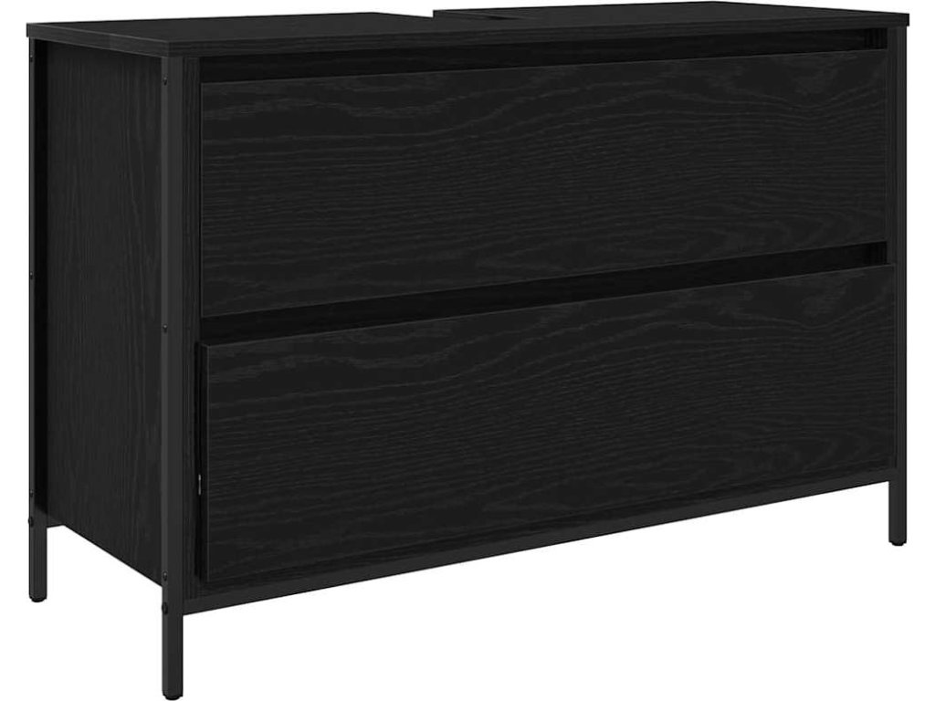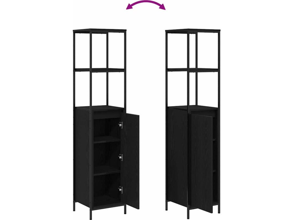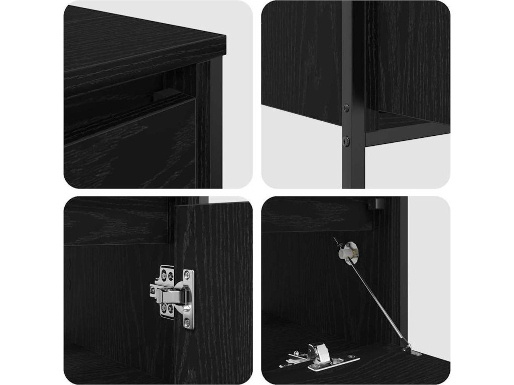 - Všestranné komponenty: Obsahuje police, postavené nohy a ploché dveře, každý prvek skvěle doplňuje celkový design a plní svou funkci. Černé kovové nohy elegantně kontrastují s inženýrským dřevem, čímž přidávají nádech moderní sofistikovanosti.