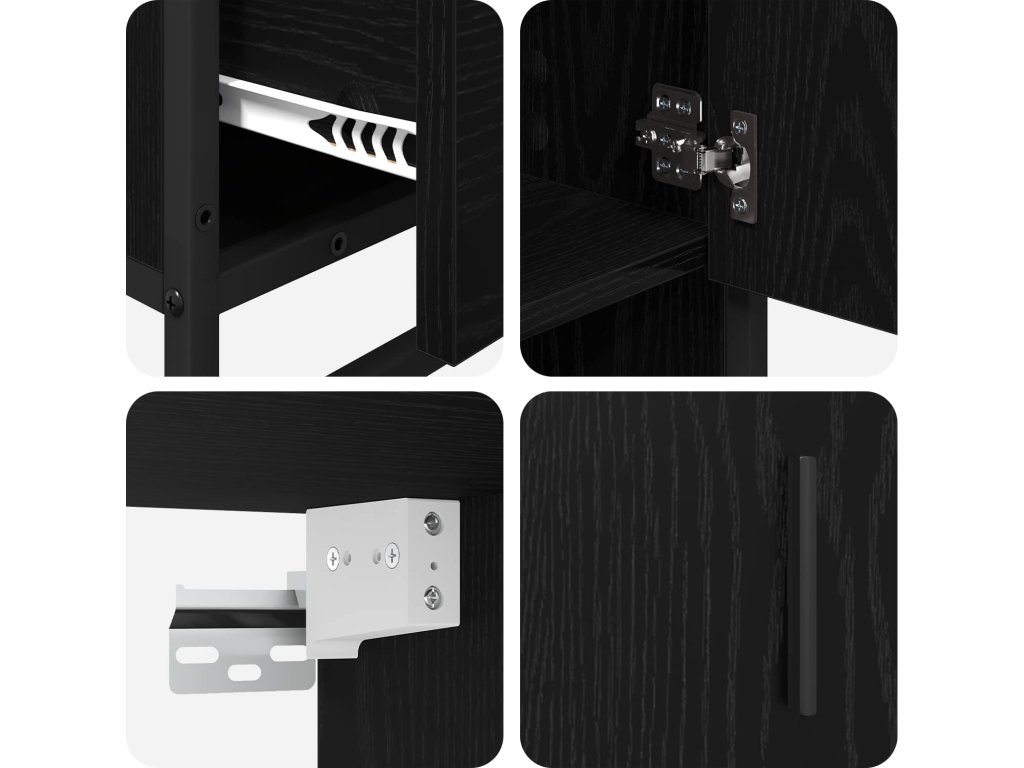 Tahle sada moderního koupelnového nábytku dělá z vaší koupelny elegantní a funkční prostor. Díky štíhlému designu s minimem ornamentů a čistými liniemi přetvoří každou koupelnu na útulné útočiště. Sada zahrnuje zrcadlovou skříň, umyvadlovou skříň a vysokou skříň, které nabízejí univerzální řešení úložného prostoru, a splní všechny vaše organizační potřeby. Černé součásti skvěle kontrastují s kompozitním dřevem a vytváří vizuálně přitažlivou sestavu, která dodá vašemu prostoru kapku sofistikovanosti.