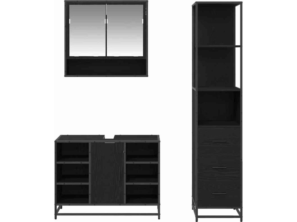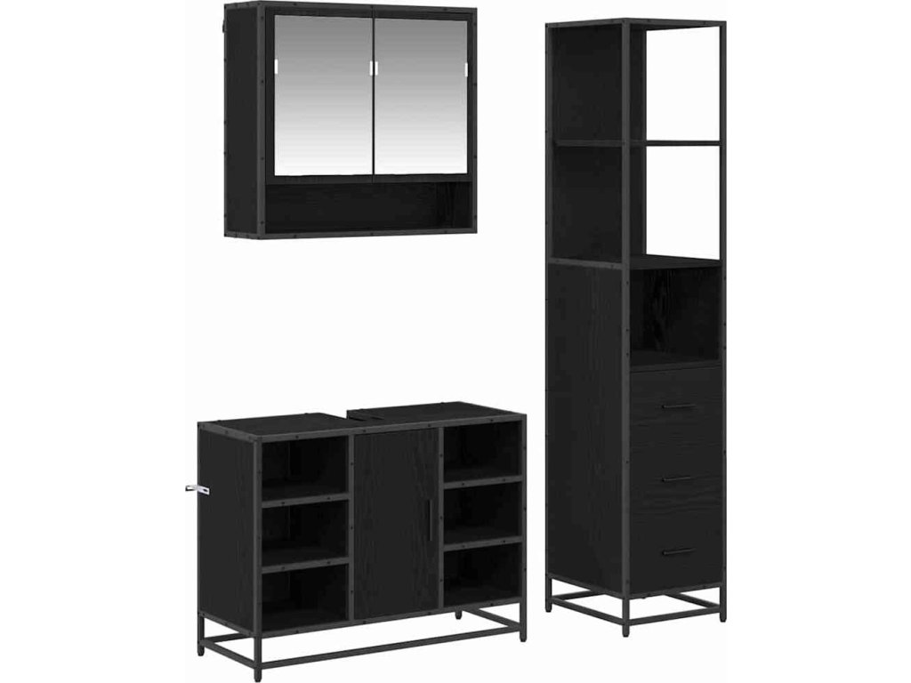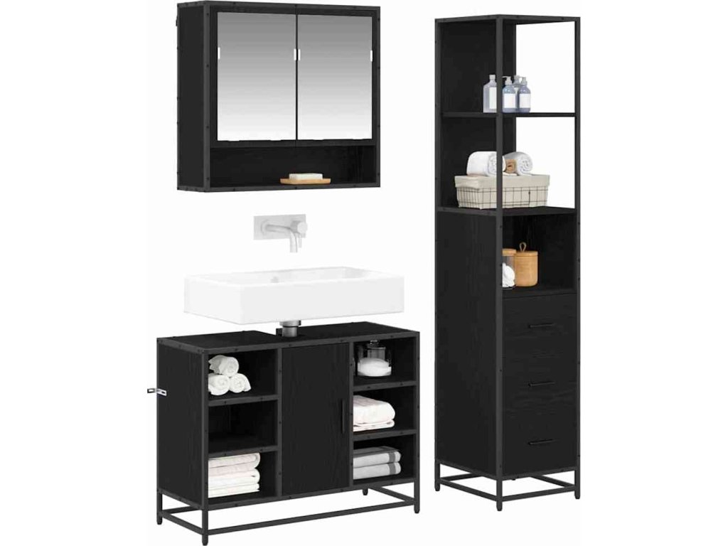 - Kompletní souprava: Souprava zahrnuje zrcadlovou skříň, umyvadlovou skříň a vysokou koupelnovou skříň s různými úložnými možnostmi. Zrcadlová skříňka usnadní přístup k osobním věcem a umyvadlová skříňka přináší praktčko pod umyvadlo, zatímco vysoká skříňka má dostatek prostoru na ručníky a toaletní potřeby.