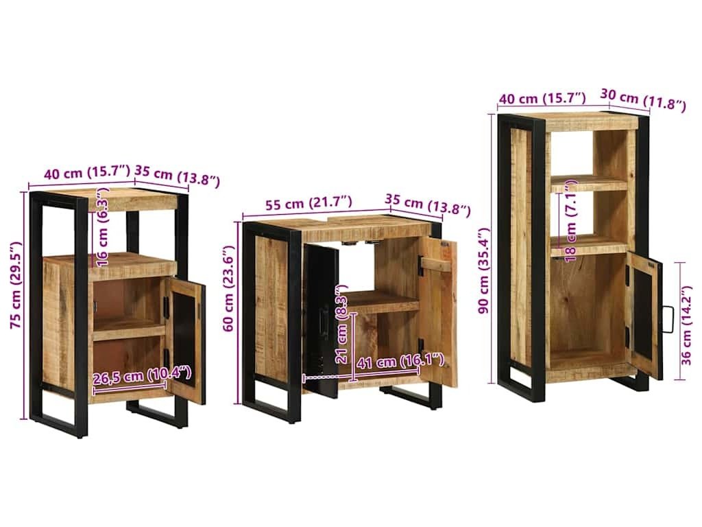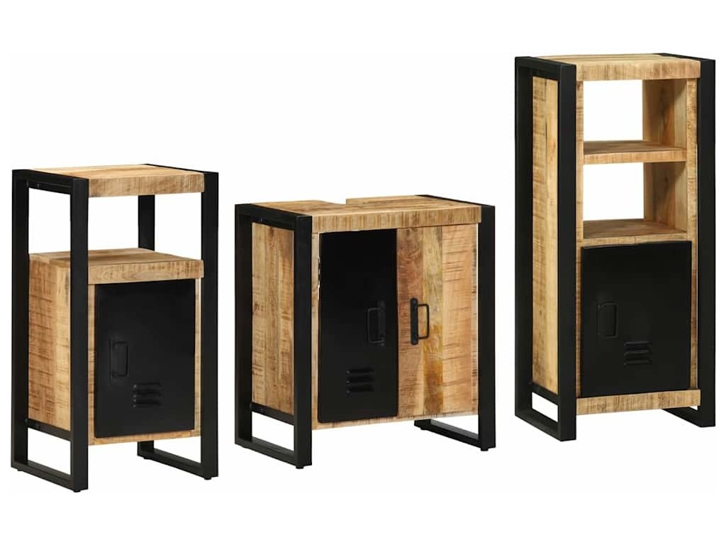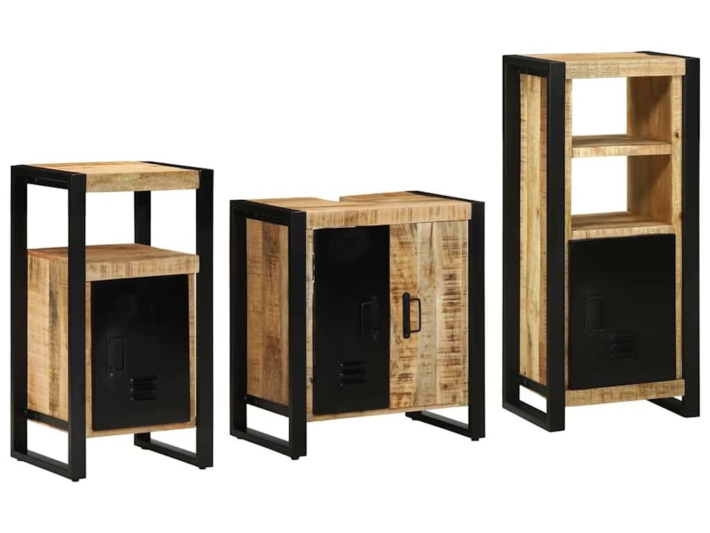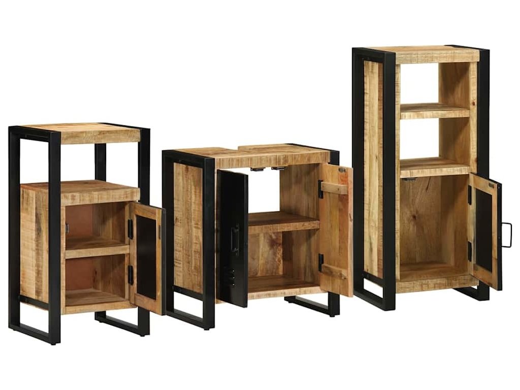 - Robustní železná konstrukce: Vyrobené z železa, tato sada zaručuje nekompromisní odolnost, ideální pro každodenní používání. Materiál zajišťuje, že skříňky snesou vlhkost koupelny.