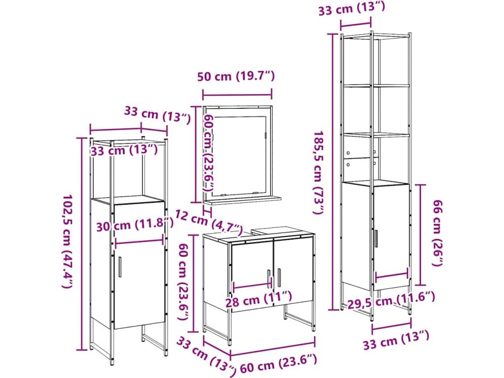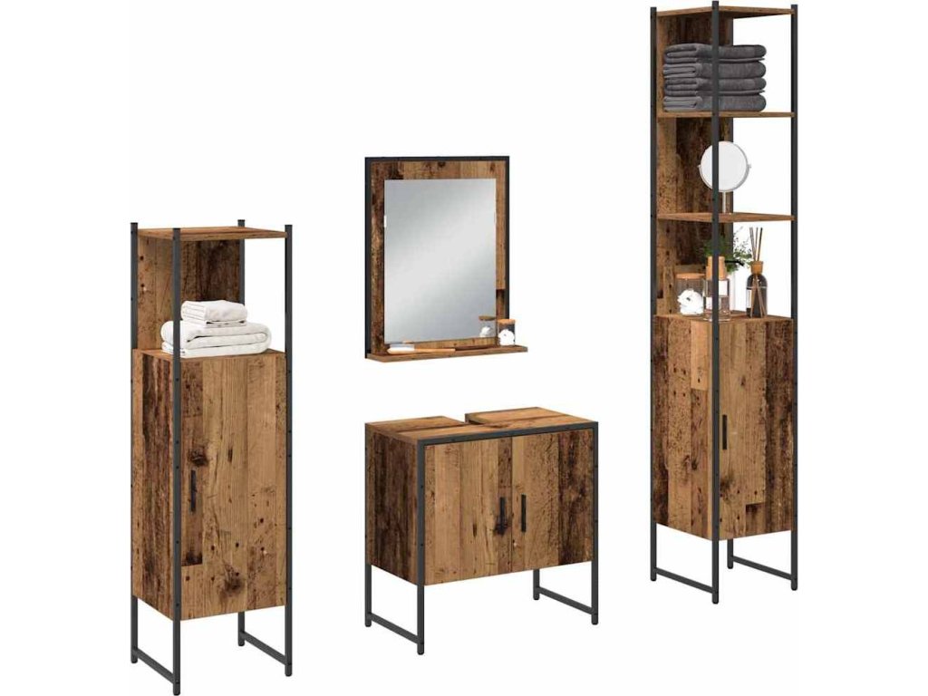 - Součásti: Souprava obsahuje vysokou skříň, umyvadlovou skříň, koupelnovou skříň a zrcadlo, takže každý kousek má svůj úkol v organizaci a stylu. Vysoká skříň a koupelnová skříň skvěle poslouží na uložené ručníky, toaletní potřeby a další nezbytnosti. Zrcadlo je nejen praktické, ale i stylové.