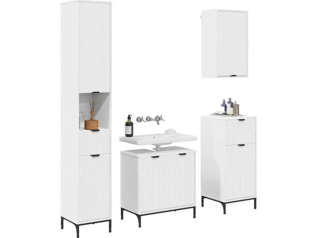 - Součásti: Sada zahrnuje kompletní úložná řešení s nástěnnou skříňkou pod umyvadlo, koupelnovou skříňkou, nástěnnou skříňkou a vysokou skříní. Každá součást zajišťuje jednoduchý přístup, zlepšuje organizaci koupelny a využití prostoru.
