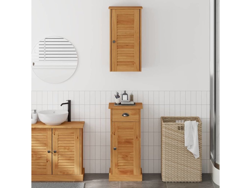 - Materiály: Vyrobený z masivního borovicového dřeva, je tenhle kabinet odolný a navržený, aby vydržel, a přitom dává vaší koupelně rustikální vibe. Kombinace dřeva a kovových prvků vytváří silnou podporu s nadčasovým stylem, hodící se do různých designů.