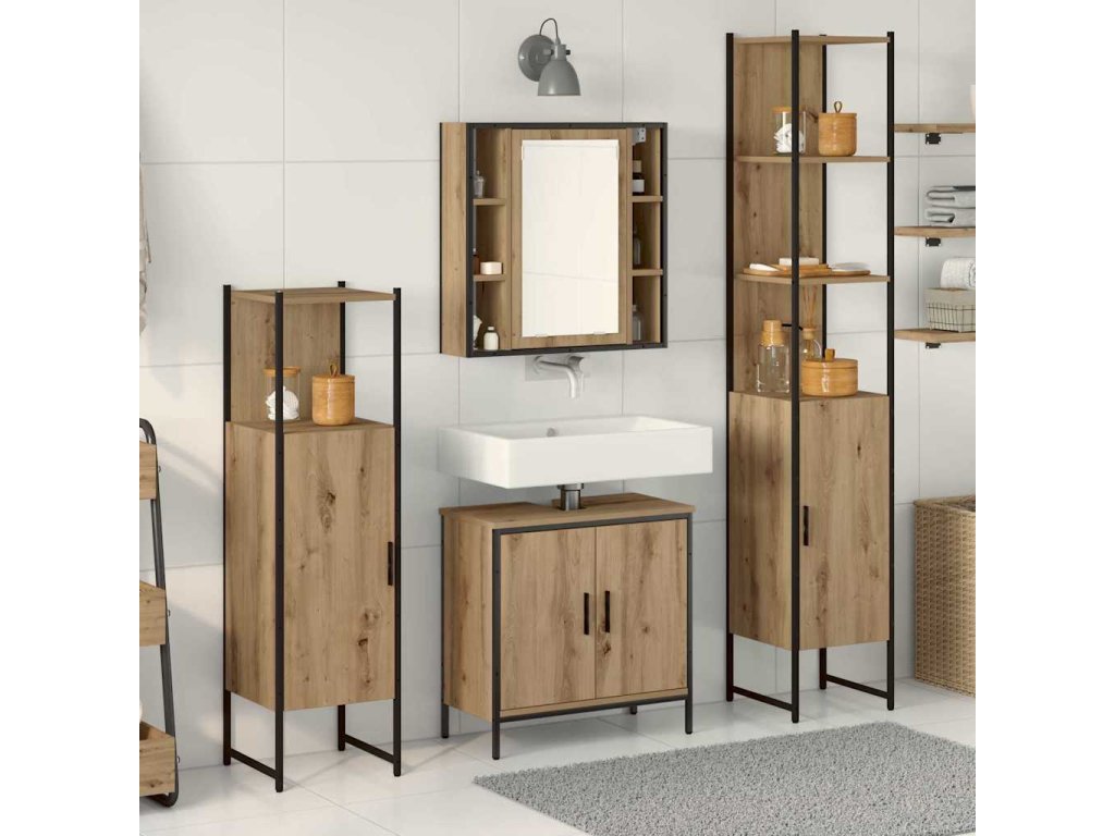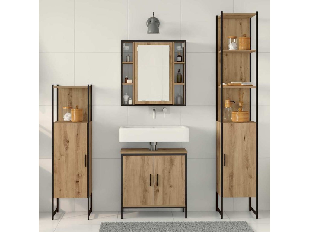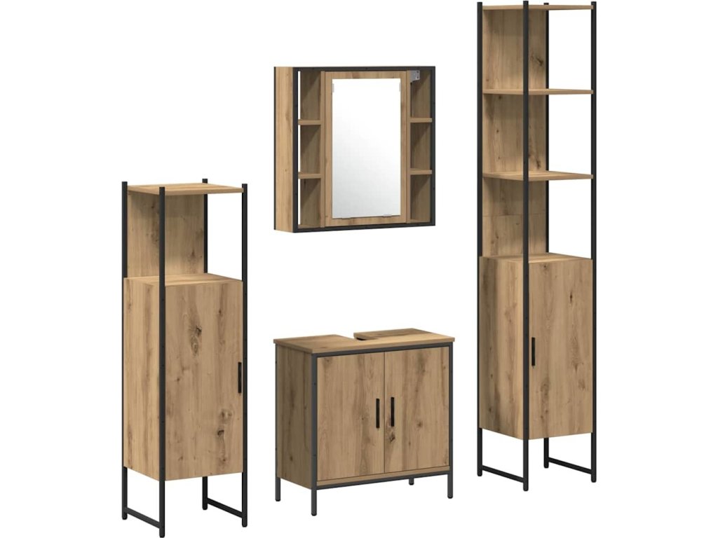 - Kompletní úložná souprava: Sada obsahuje možnosti úložného prostoru: zrcadlovku pro snadný přístup k toaletním potřebám, umyvadlovku na věci pod umyvadlem, vysokou skříňku na další ručníky a standardní skříňku na různorodé úložiště. Každý kus je navržený tak, aby zajistil pořádek a nedělalo to nepořádek.