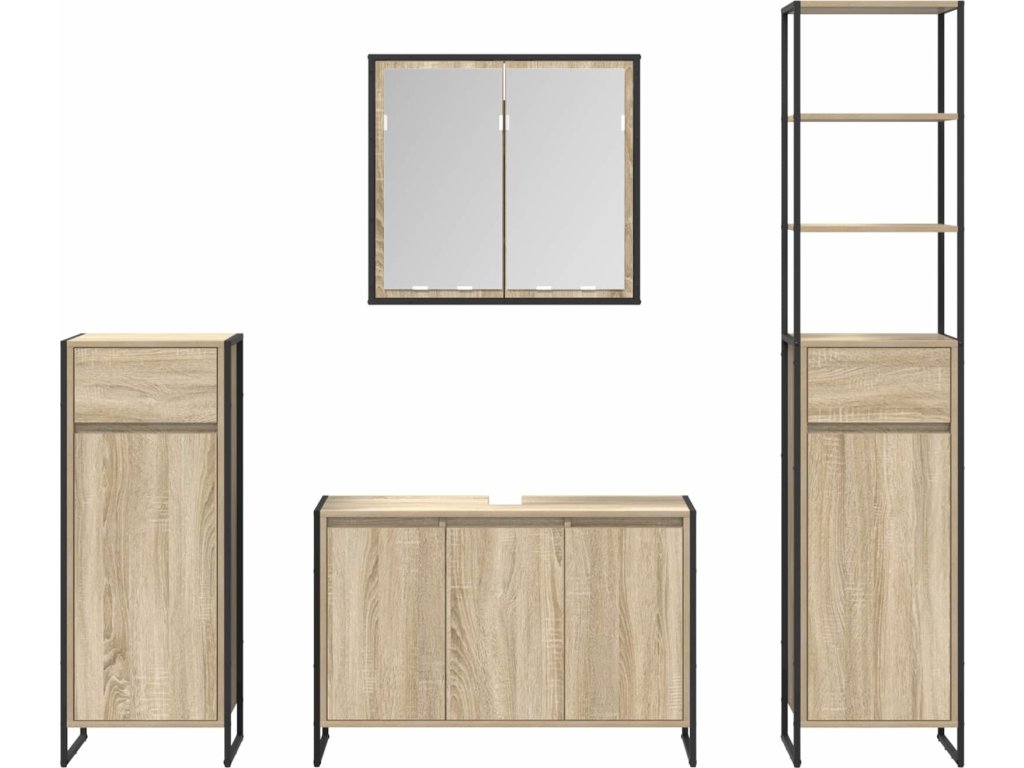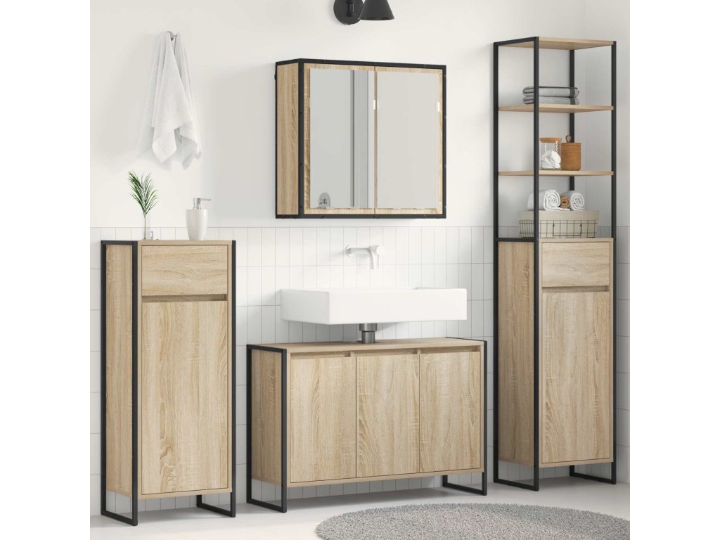 Tato koupelnová sada spojuje moderní eleganci s funkčností. Je ideální pro městské prostory, nabízí efektivní úložení a sladěný design. Kombinace inženýrské dřeviny a oceli zaručuje odolnost, a to nejen prakticky, ale i esteticky.