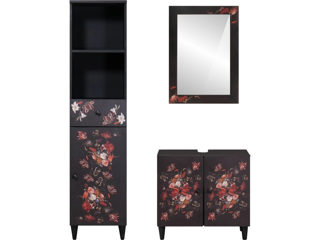- Zahrnuté součásti: Sada obsahuje zrcadlovou skříňku s rovinným zrcadlem, skříňku pod umyvadlo a další úložnou skříňku, takže praktické spojení s elegancí. Zrcadlo je ideální pro úpravy, a skříňky nabízejí dostatek místa pro kosmetiku a toaletní potřeby, podpořeno robustními policemi.