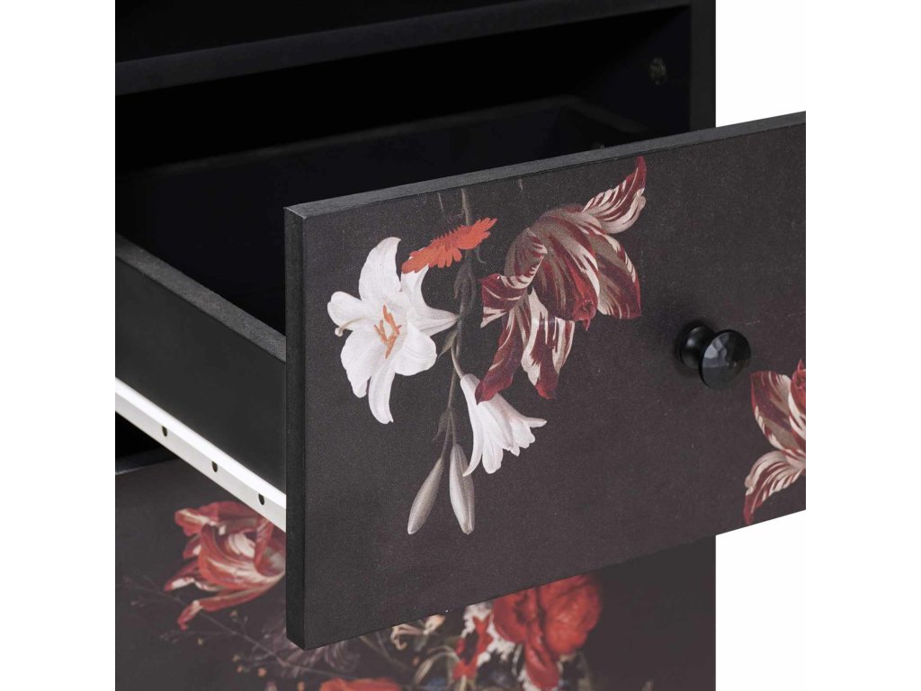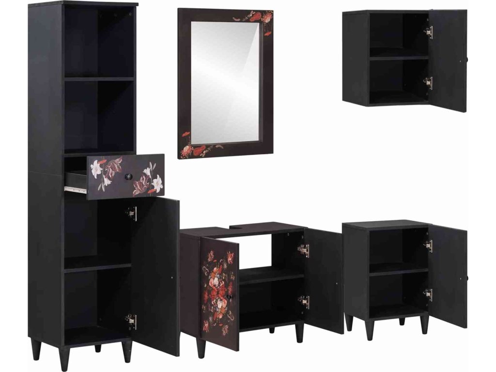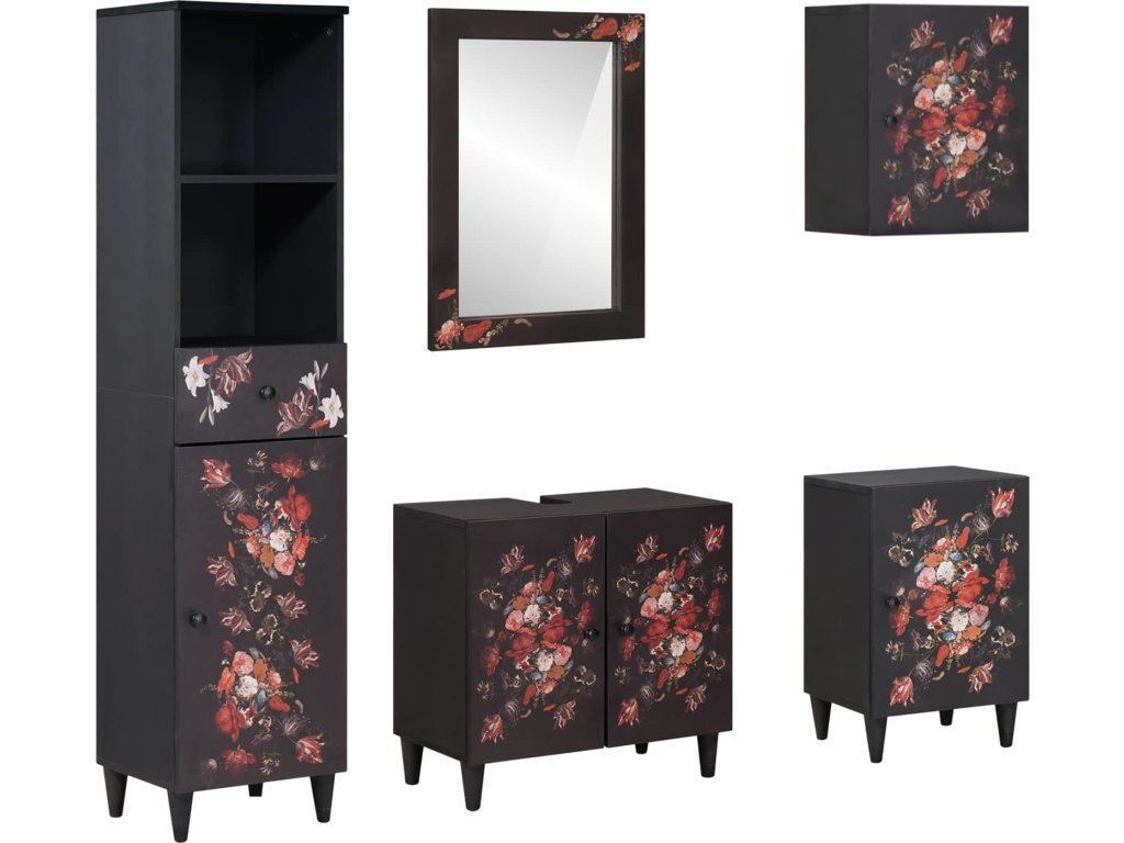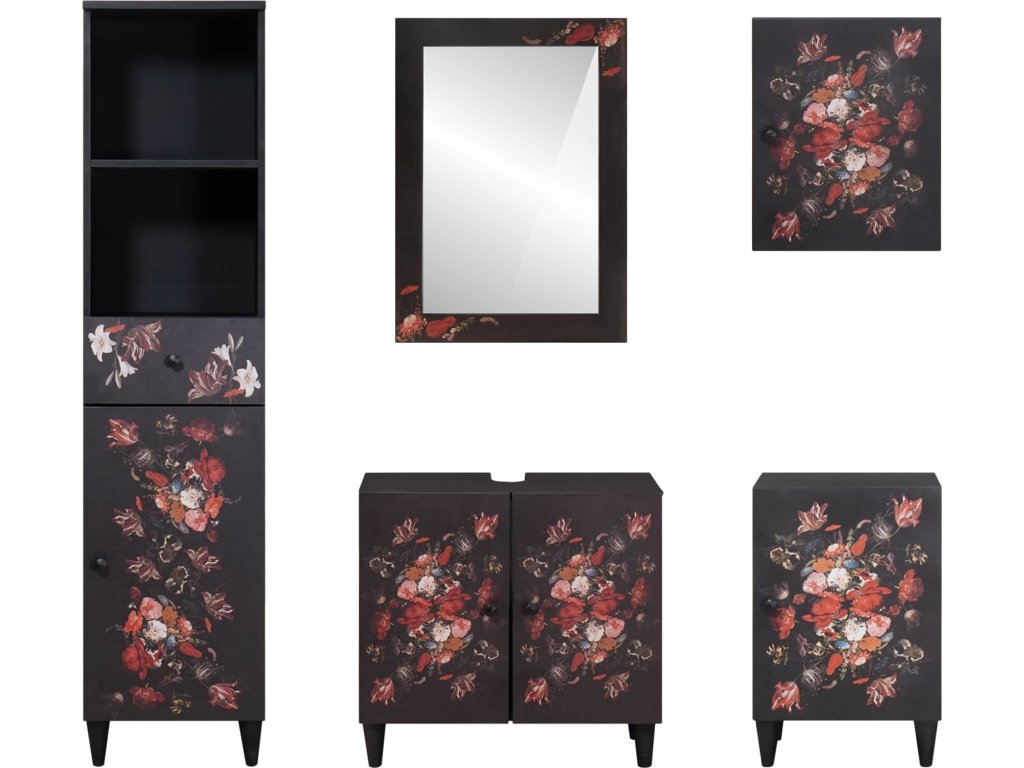 - Moderní styl a funkčnost: Užijte si moderní estetiku s elegantním profilem a čistými liniemi. Doplňky jako mosazné knoflíky přidávají decentní eleganci a jemný květinový vzor pro kapku hravosti, takže tento set skříněk dokazuje, že funkčnost a styl mohou jít ruku v ruce.
