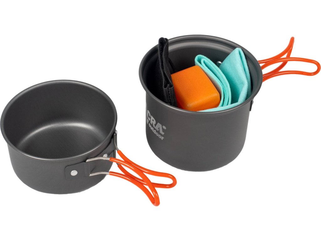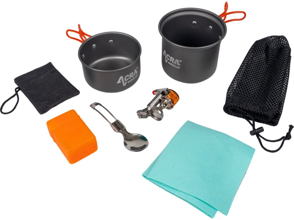 Trávíte rádi čas pod stanem nebo v kempu? Usnadněte si přípravu jídla a pořiďte si ultralehkou a kompaktní sadu nádobí Acra C23. Díky praktickým skládacím rukojetím ušetříte místo ve svém batohu. Pomocí sady připravíte oběd nebo večeři až pro 2 osoby. Hodí se pro turistiku, na kempování i na piknik.