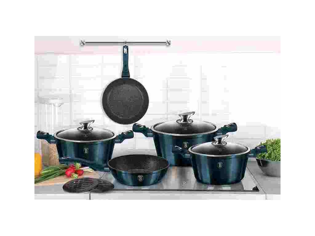 Luxusní sada nádobí BerlingerHaus z kolekce Aquamarine Metallic Line v atraktivním designu zaujme nejen vzhledem, ale i špičkovými vlastnostmi. Díky 3vrstvému nepřilnavému povrchu s mramorovým efektem se potraviny nepřipalují a nádobí se snadno čistí. Sada je vhodná pro zdravé vaření s minimem tuku a pro všechny typy sporáků včetně indukce.