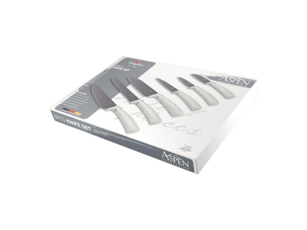 Sada Berlingerhaus Aspen Collection se skládá z 6 nožů v magnetické dárkové krabičce. Ostré čepele jsou potažené šedým nepřilnavým povrchem s antibakteriální úpravou. Krájené potraviny na nich neulpívají. Snadno je tedy očistíte.