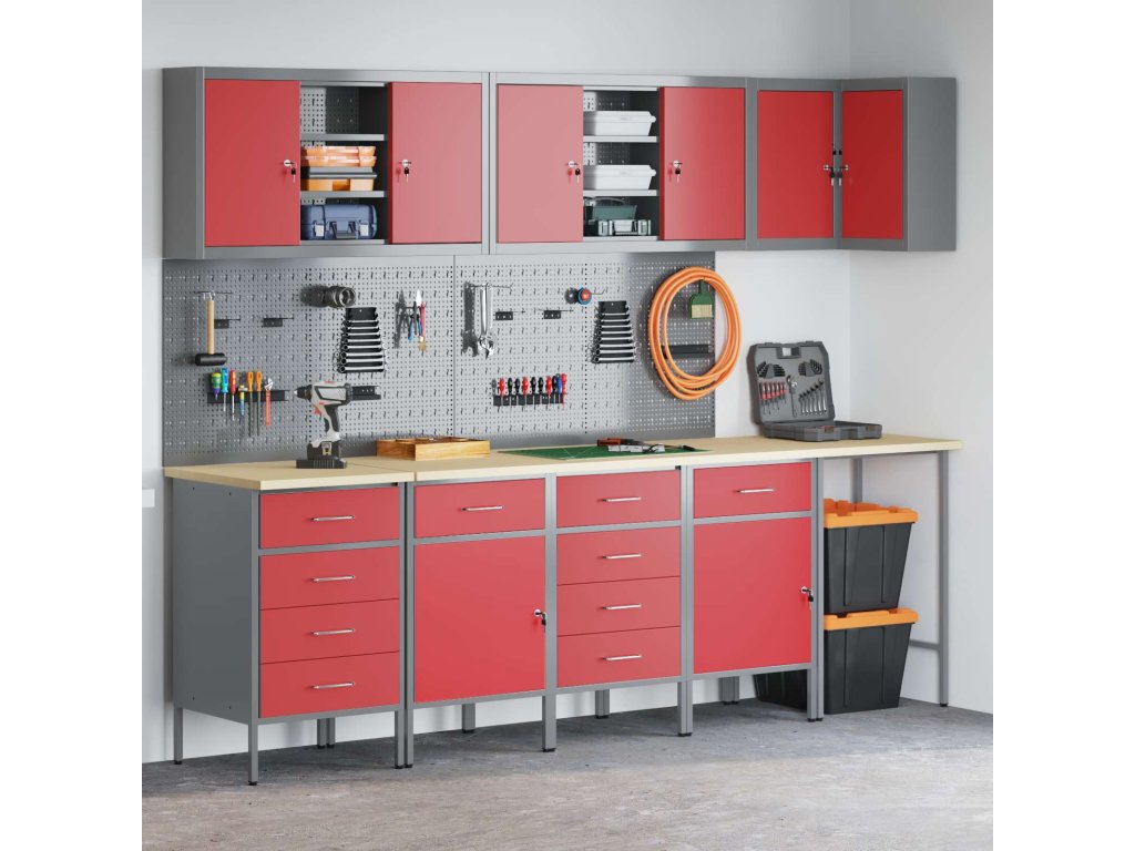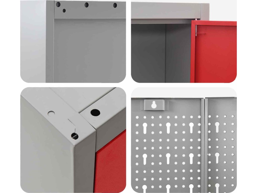 - Materiály: Skříňka je vyrobená z práškově lakované oceli a kompozitního dřeva, takže je robustní a dlouhotrvající pro skladování nářadí. Tyto materiály jsou vybrané pro svou pevnost a odolnost, což prodlužuje její životnost. Práškový povrch je odolný proti opotřebení, takže vydrží dlouho.