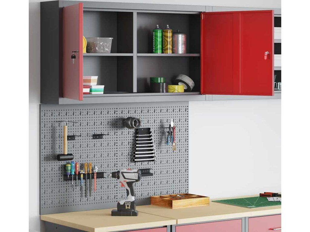 - Komplexní komponenty: Skříňka má kovové police z práškově lakované oceli, které snesou hodně hmotnosti a časté používání. Kovové závěsné desky umožňují snadné přizpůsobení organizace nářadí podle různých typů a velikostí nářadí.