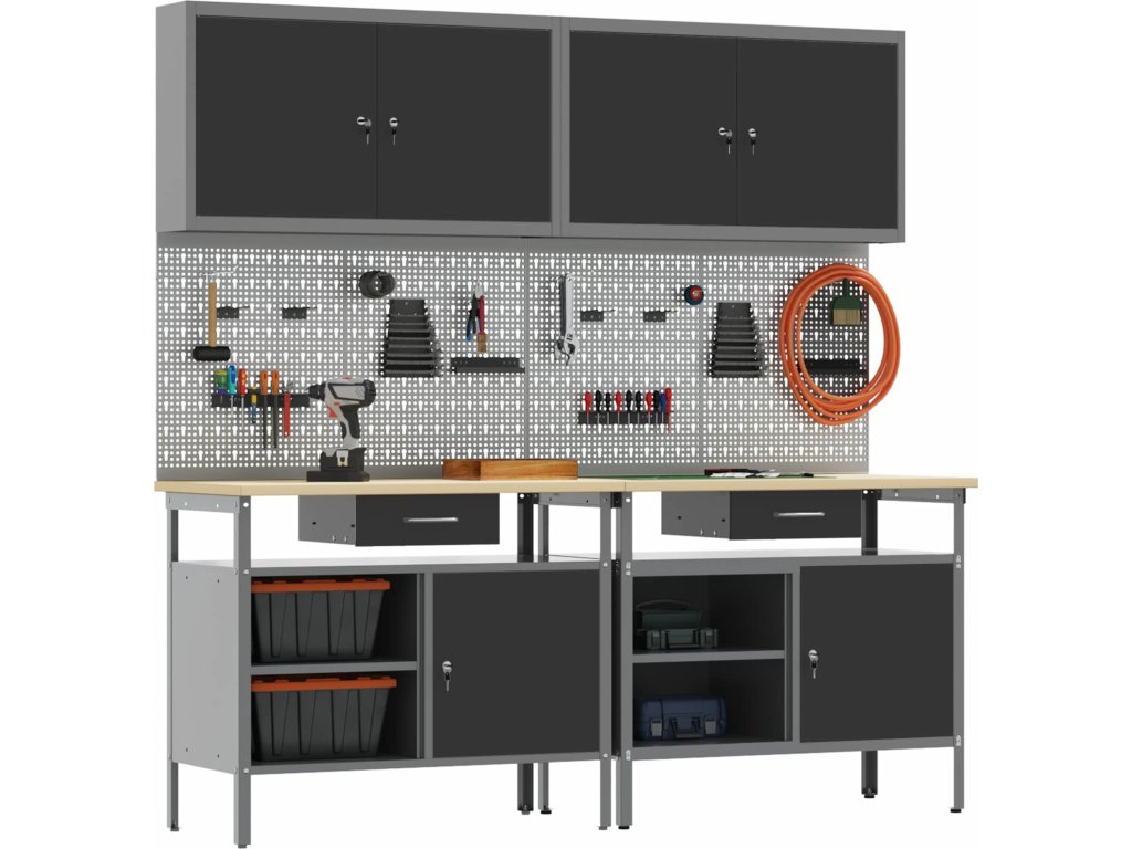 Tato sada pracovních stolů z oceli je ideální kombinací funkčnosti a průmyslového stylu pro profesionální dílny i domácí garáže. Obdélníkový stůl zvládne i těžší úkoly a má moderní design. Díky hladkému povrchu se bezproblémově hodí do jakéhokoliv prostoru. Kovové police poskytují dost úložného místa, takže máte nářadí a potřeby pěkně srovnané a přehledné. Představte si tento stůl jako středobod vašeho pracovního místa, který dodává atmosféru profesionality, pořádku a stylu.
