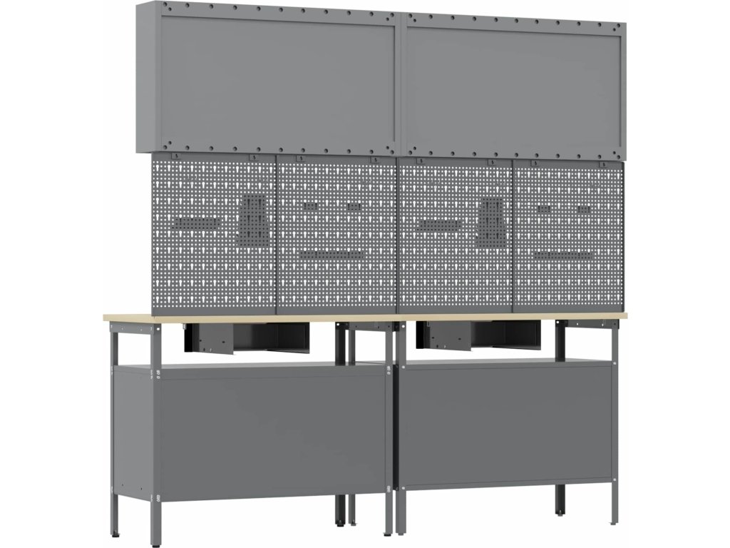 Tato sada pracovních stolů z oceli je ideální kombinací funkčnosti a průmyslového stylu pro profesionální dílny i domácí garáže. Obdélníkový stůl zvládne i těžší úkoly a má moderní design. Díky hladkému povrchu se bezproblémově hodí do jakéhokoliv prostoru. Kovové police poskytují dost úložného místa, takže máte nářadí a potřeby pěkně srovnané a přehledné. Představte si tento stůl jako středobod vašeho pracovního místa, který dodává atmosféru profesionality, pořádku a stylu.