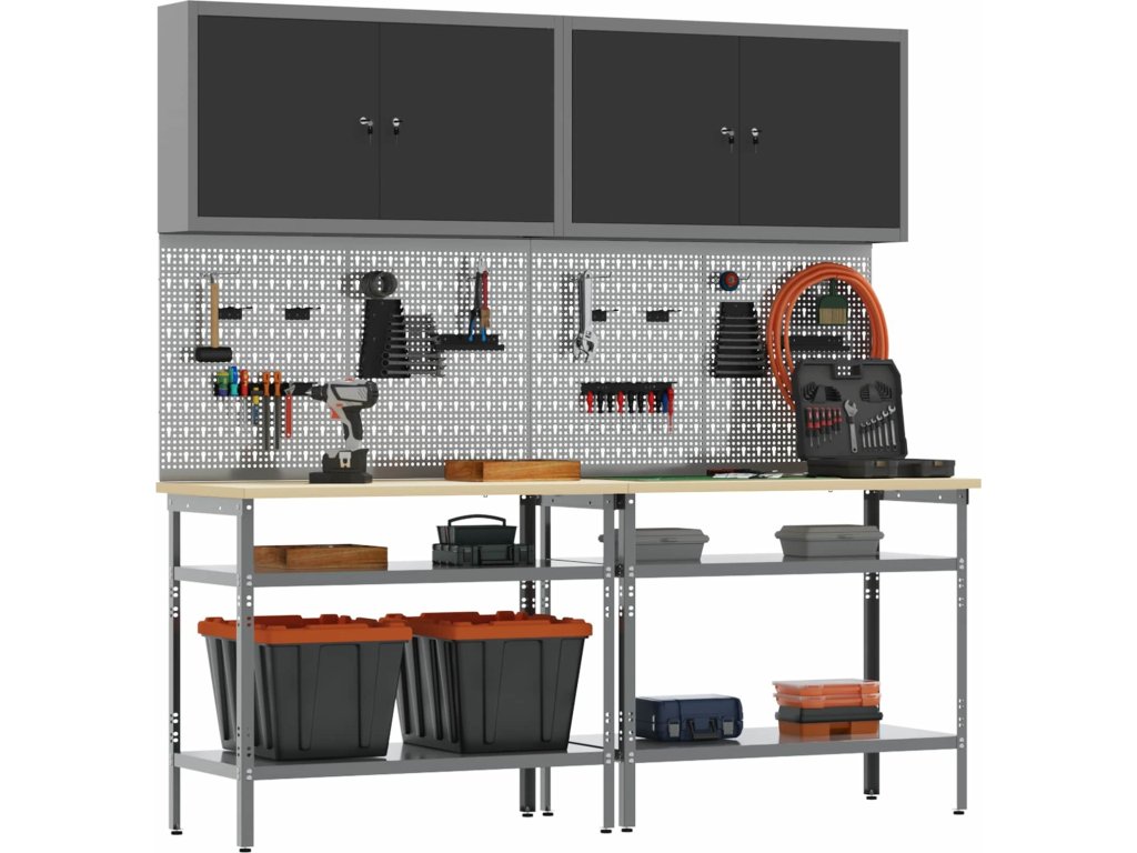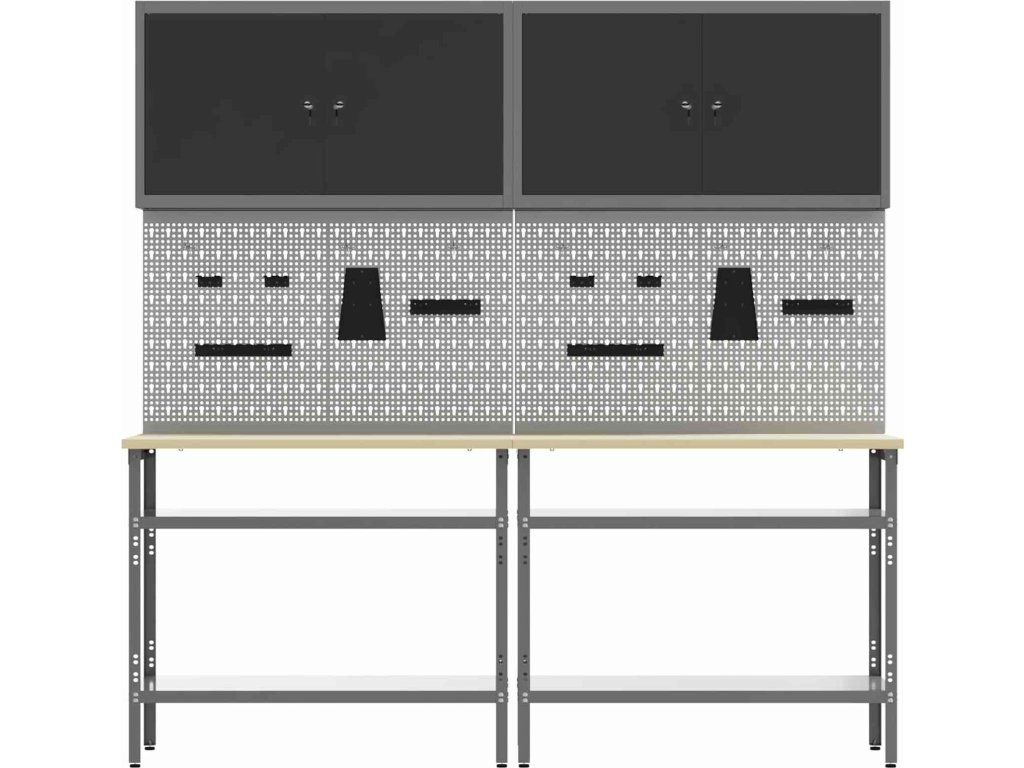 Tato sada pracovních stolů z oceli je ideální kombinací funkčnosti a průmyslového stylu pro profesionální dílny i domácí garáže. Obdélníkový stůl zvládne i těžší úkoly a má moderní design. Díky hladkému povrchu se bezproblémově hodí do jakéhokoliv prostoru. Kovové police poskytují dost úložného místa, takže máte nářadí a potřeby pěkně srovnané a přehledné. Představte si tento stůl jako středobod vašeho pracovního místa, který dodává atmosféru profesionality, pořádku a stylu.