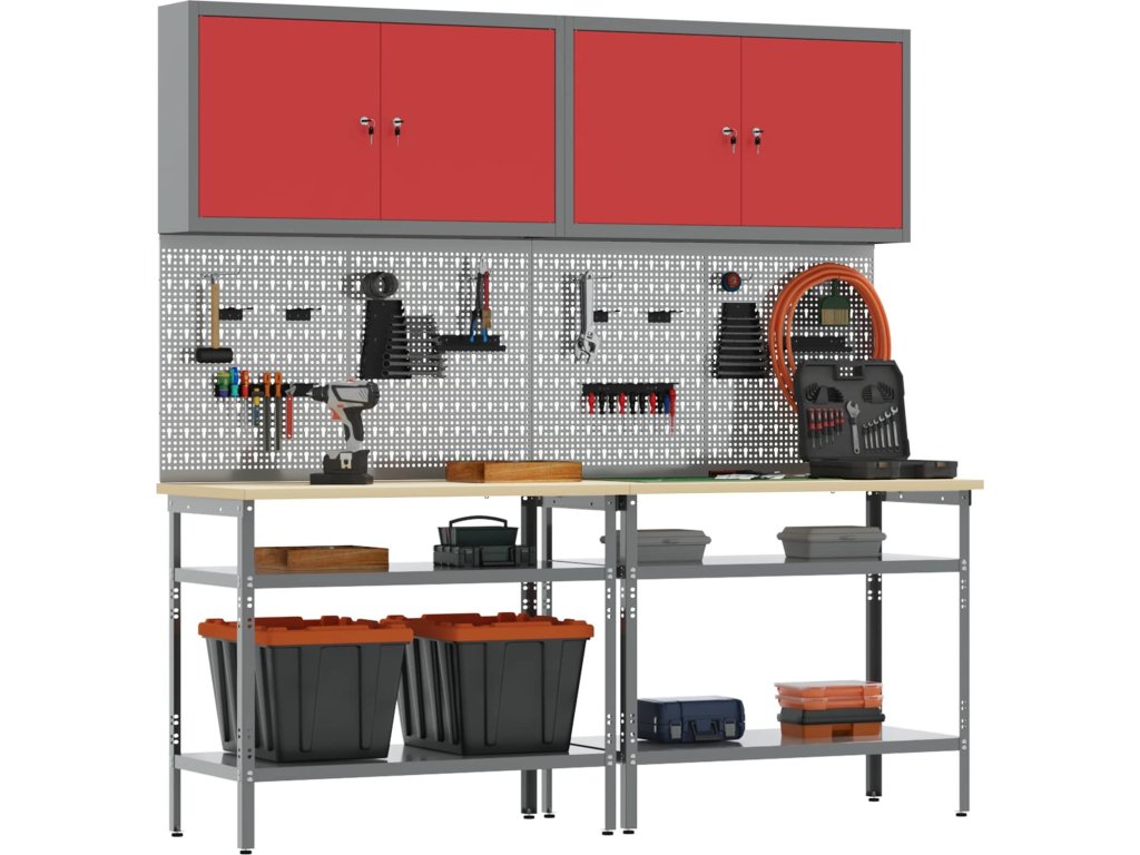 - Kovové police: Tyto police nabízejí dost místa na nářadí. Jsou navržené pro časté používání a unese hodně hmotnosti, což usnadňuje organizaci.