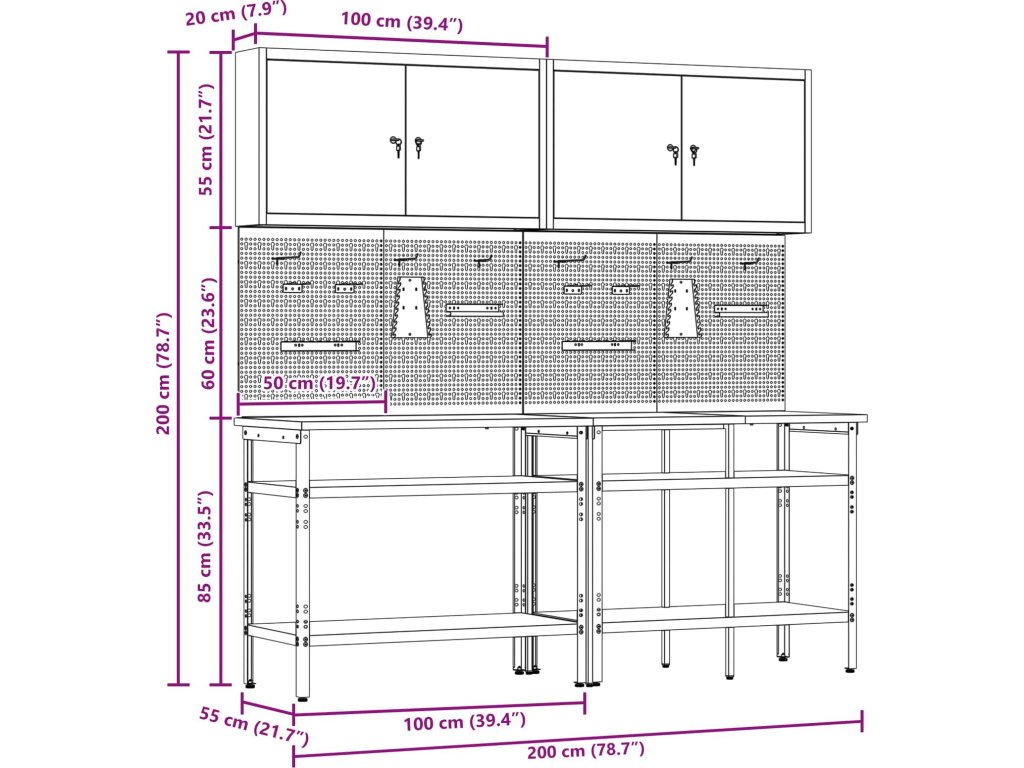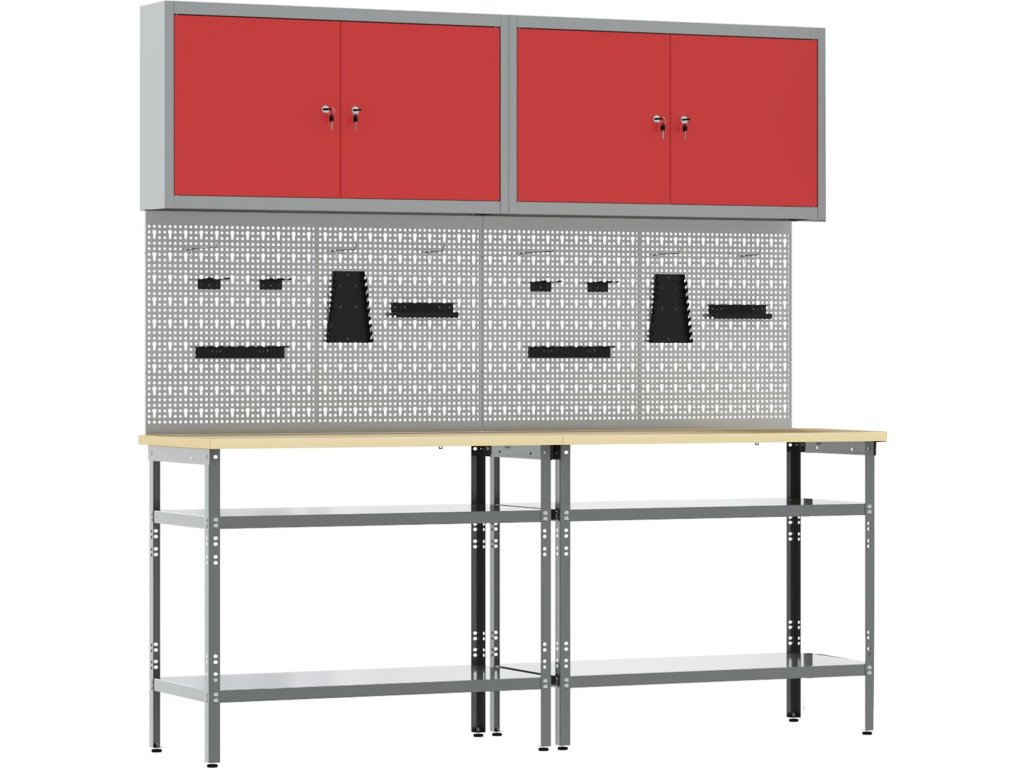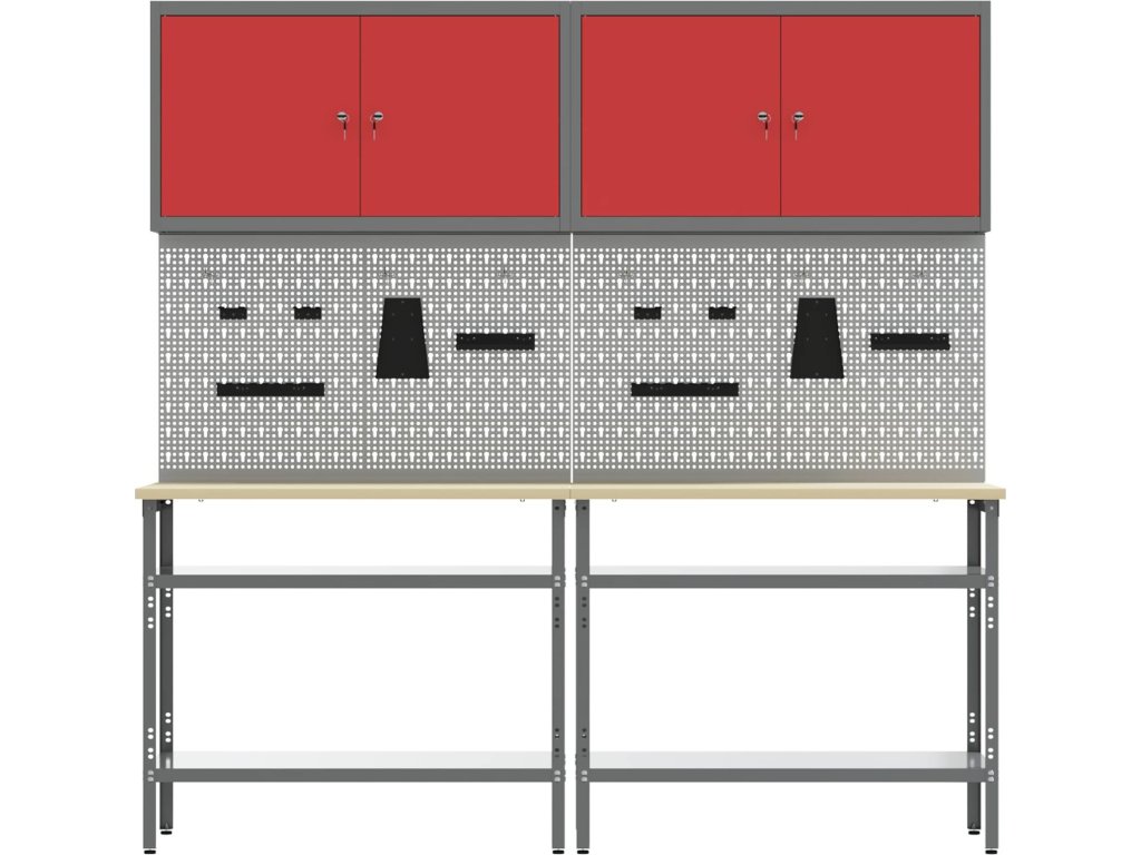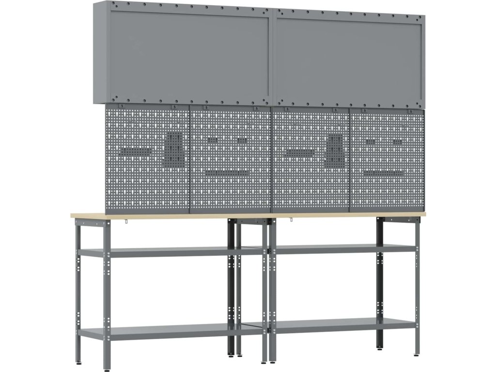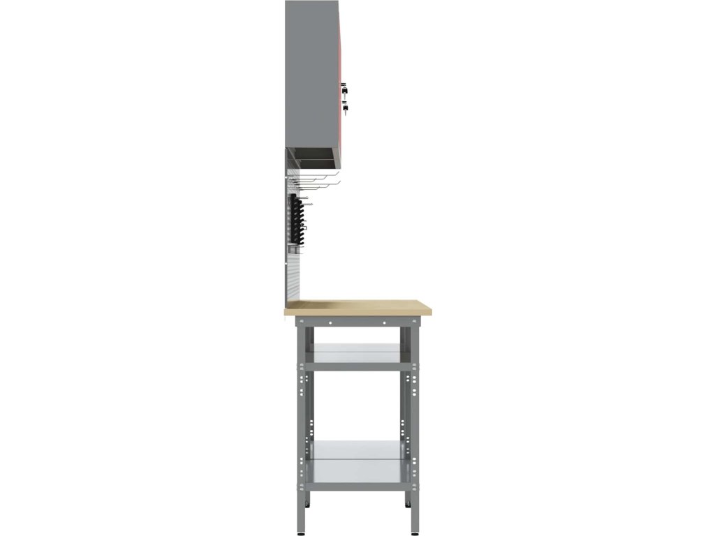 Tato sada pracovních stolů z oceli je ideální kombinací funkčnosti a průmyslového stylu pro profesionální dílny i domácí garáže. Obdélníkový stůl zvládne i těžší úkoly a má moderní design. Díky hladkému povrchu se bezproblémově hodí do jakéhokoliv prostoru. Kovové police poskytují dost úložného místa, takže máte nářadí a potřeby pěkně srovnané a přehledné. Představte si tento stůl jako středobod vašeho pracovního místa, který dodává atmosféru profesionality, pořádku a stylu.