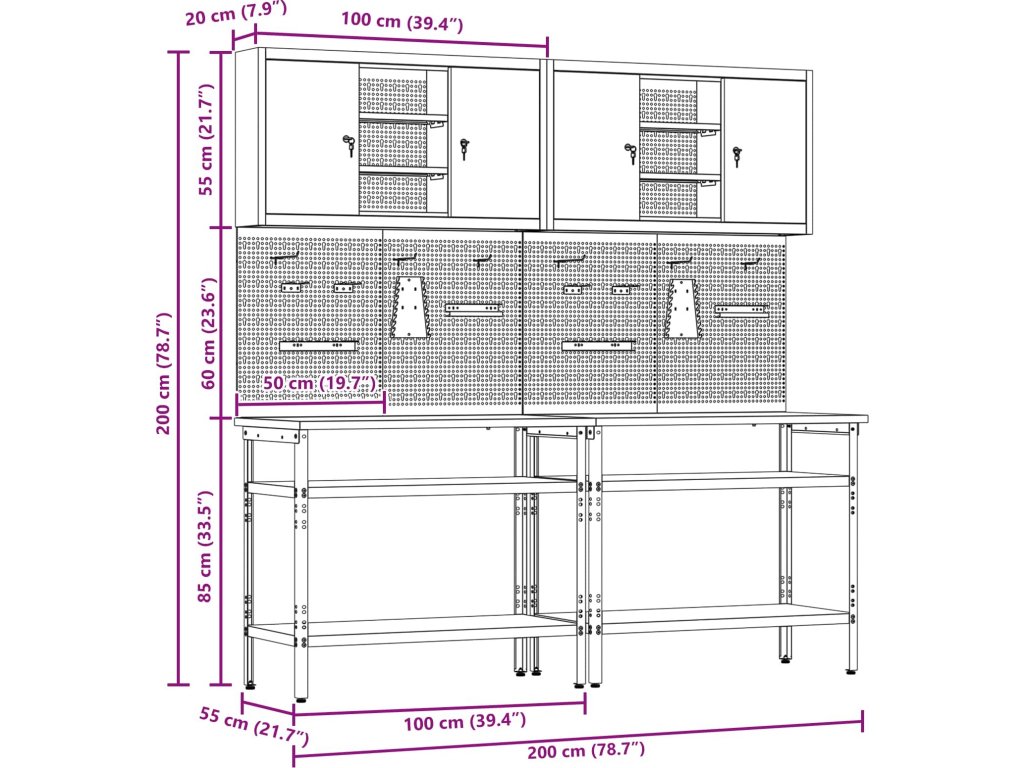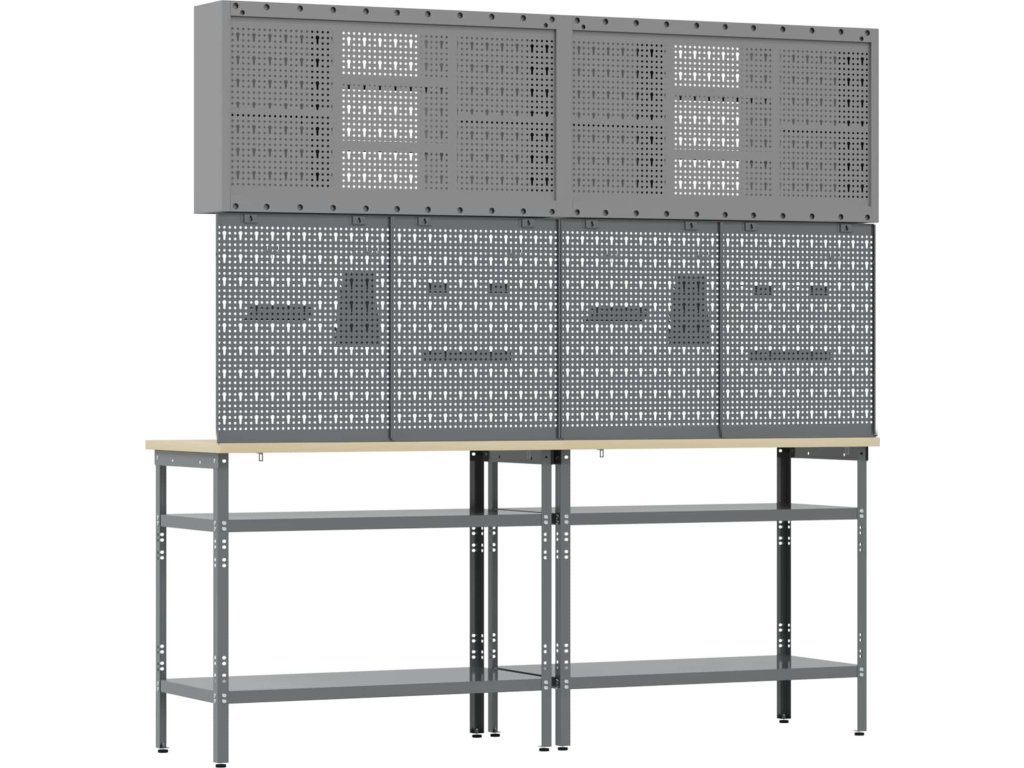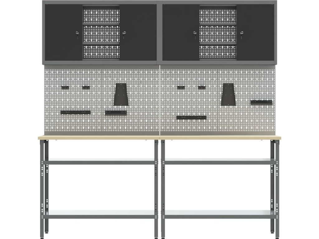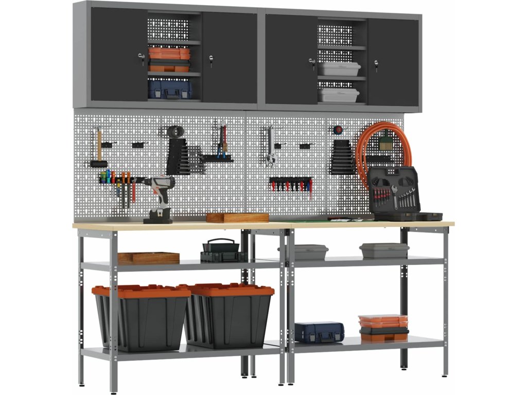 Tato sada pracovních stolů z oceli je ideální kombinací funkčnosti a průmyslového stylu pro profesionální dílny i domácí garáže. Obdélníkový stůl zvládne i těžší úkoly a má moderní design. Díky hladkému povrchu se bezproblémově hodí do jakéhokoliv prostoru. Kovové police poskytují dost úložného místa, takže máte nářadí a potřeby pěkně srovnané a přehledné. Představte si tento stůl jako středobod vašeho pracovního místa, který dodává atmosféru profesionality, pořádku a stylu.
