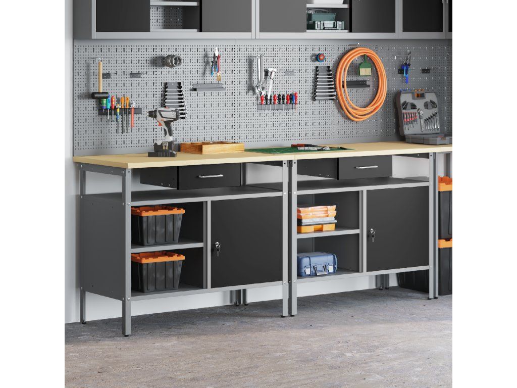 Tato sada pracovních stolů z oceli je ideální kombinací funkčnosti a průmyslového stylu pro profesionální dílny i domácí garáže. Obdélníkový stůl zvládne i těžší úkoly a má moderní design. Díky hladkému povrchu se bezproblémově hodí do jakéhokoliv prostoru. Kovové police poskytují dost úložného místa, takže máte nářadí a potřeby pěkně srovnané a přehledné. Představte si tento stůl jako středobod vašeho pracovního místa, který dodává atmosféru profesionality, pořádku a stylu.