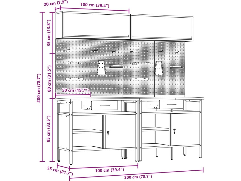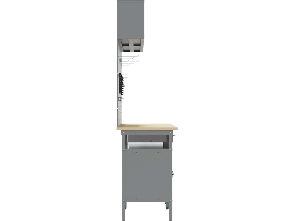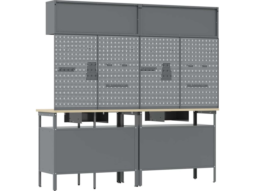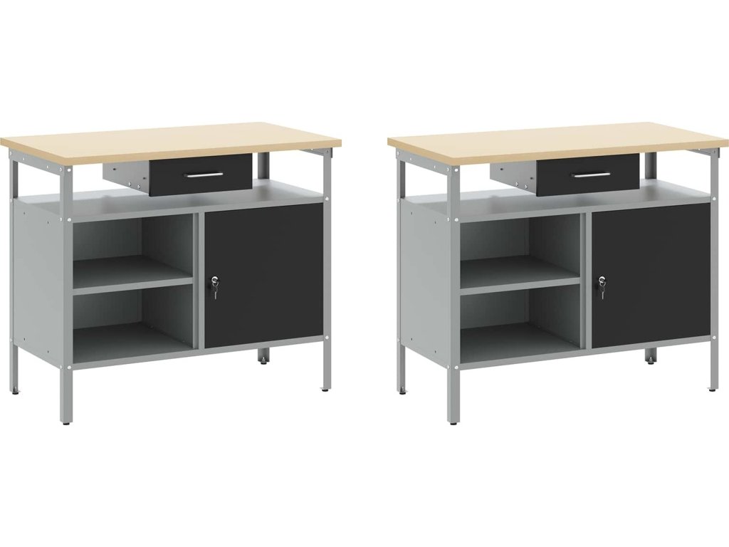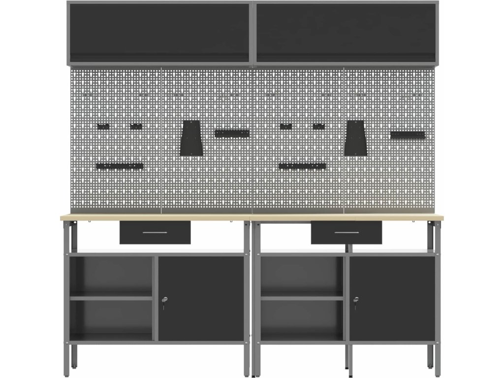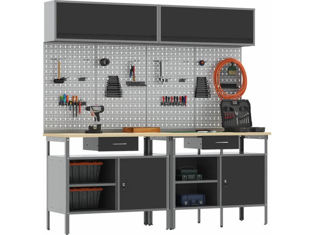 Tato sada pracovních stolů z oceli je ideální kombinací funkčnosti a průmyslového stylu pro profesionální dílny i domácí garáže. Obdélníkový stůl zvládne i těžší úkoly a má moderní design. Díky hladkému povrchu se bezproblémově hodí do jakéhokoliv prostoru. Kovové police poskytují dost úložného místa, takže máte nářadí a potřeby pěkně srovnané a přehledné. Představte si tento stůl jako středobod vašeho pracovního místa, který dodává atmosféru profesionality, pořádku a stylu.