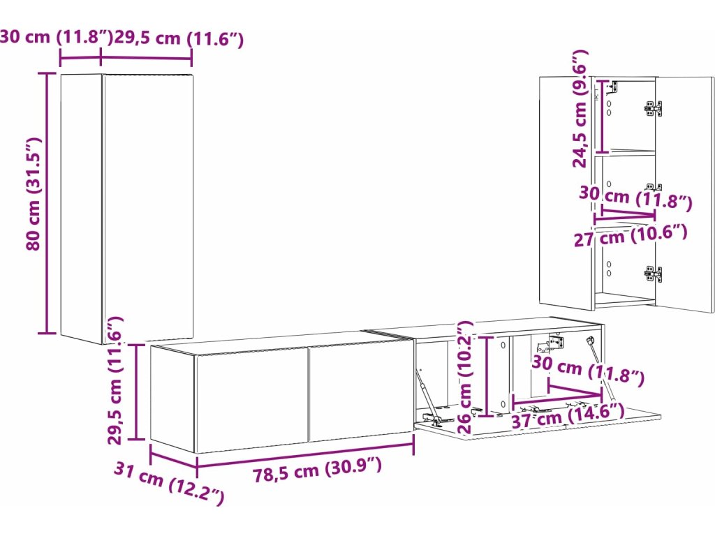 - 2 x nástěnná skříňka pod TV: 29,5 x 30 x 80 cm (D x Š x V)