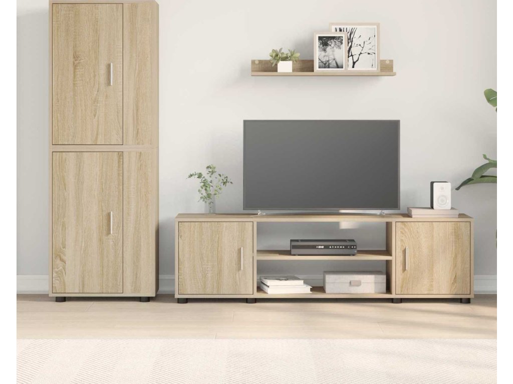 Tato nástěnná skříň na TV má moderní vzhled s čistými liniemi a praktičností. Je ideální do vnitřních prostor a nabízí stylová úložná řešení díky kompozitnímu dřevu, které vypadá skvěle. Navržena tak, aby využila prostor obývacího pokoje, sada obsahuje různé komponenty, které splní tvé potřeby.