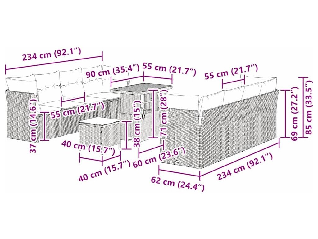 - 4 x Rohové sedadlo: 62 x 62 x 85 cm (ŠxHxV)
