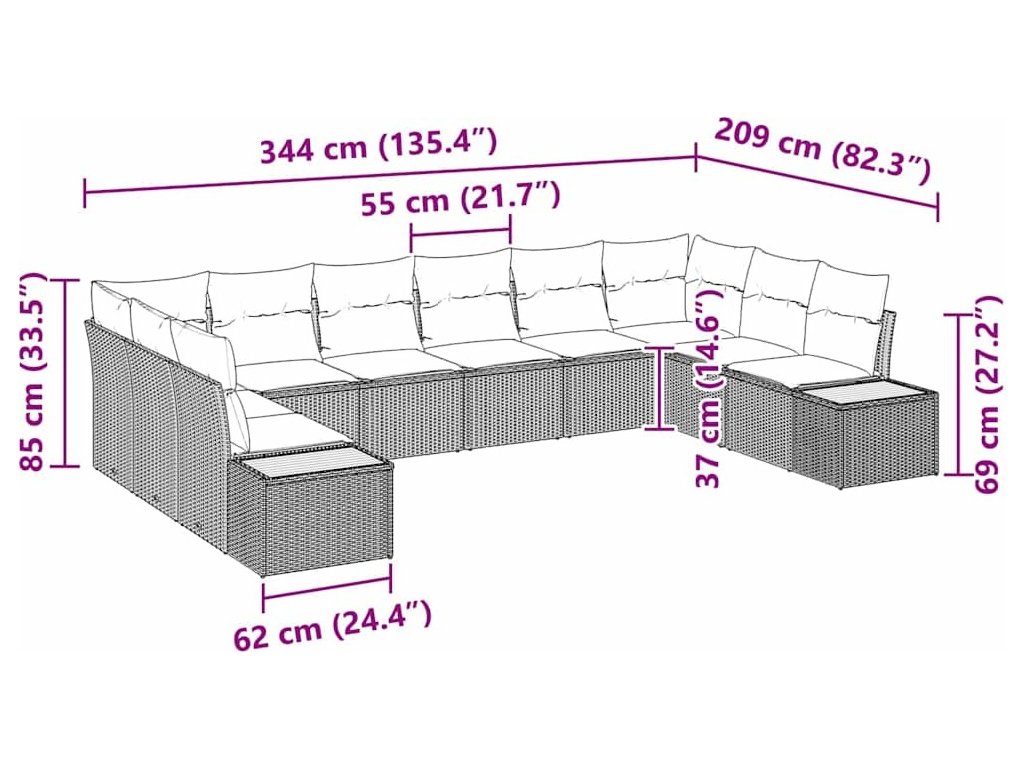 - Celkové rozměry: 344 x 209 x 85 cm (D x Š x V)