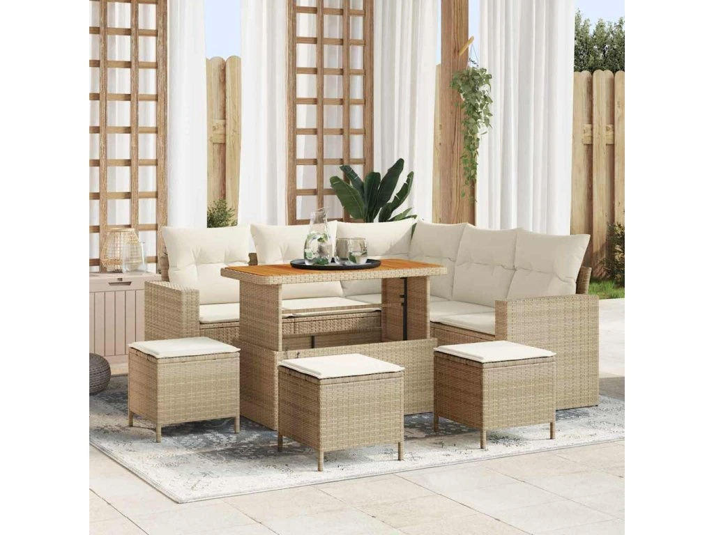 - Vysoce kvalitní materiály Sedací souprava je z prvotřídního poly ratanu a odolného masivního akáciového dřeva. Navrženo tak, aby vydrželo, materiály zajišťují, že set odolává slunci a dešti, přičemž si udrží eleganci a strukturu po sezónách.
