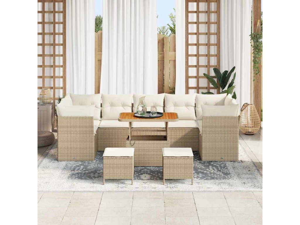 Tato modulární zahradní souprava spojuje moderní design s univerzální funkčností, takže váš venkovní prostor bude útulný. Má čisté linie s minimem ozdob, což dává kompaktní vzhled skvělý pro jarní a letní setkání. Odolná konstrukce z poly ratanu a masivního akáciového dřeva zajišťuje, že vydrží nápor počasí. Je ideální pro zahrady a terasy a pomůže vám užít si venkovní zážitky, ať už pořádáte večírek, nebo si chcete jen tak odpočinout.