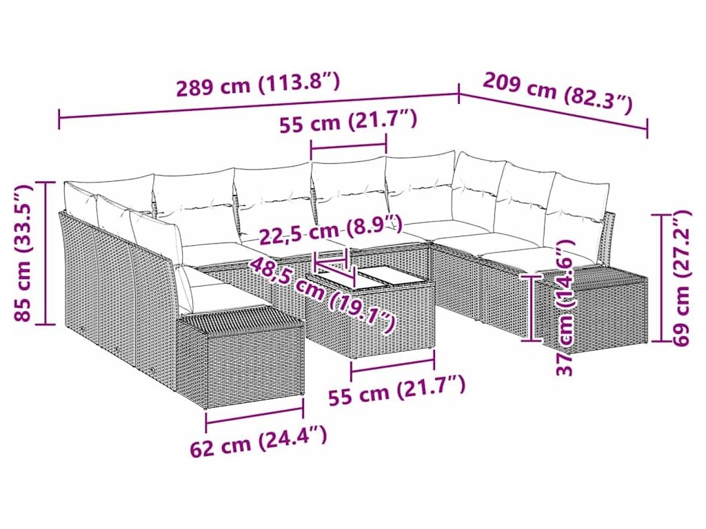 - 2 x Boční pohovka: 55 x 55 x 37 cm (D x Š x V)